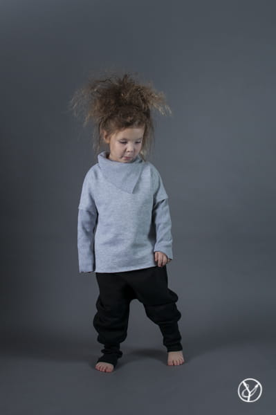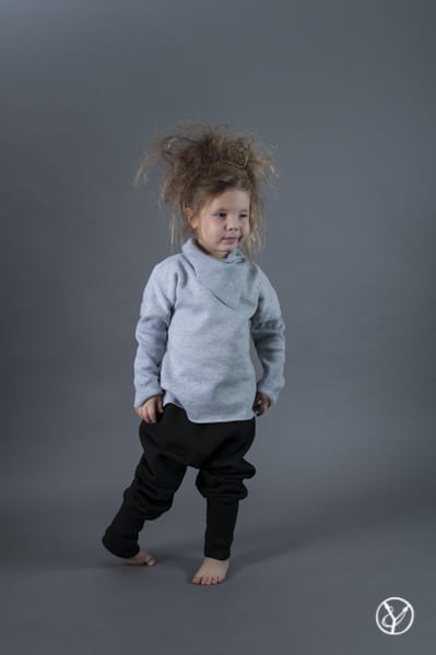 Uniwersalna dziecięca bluza z kołnierzem uszyta z dzianiny bawełnianej.
