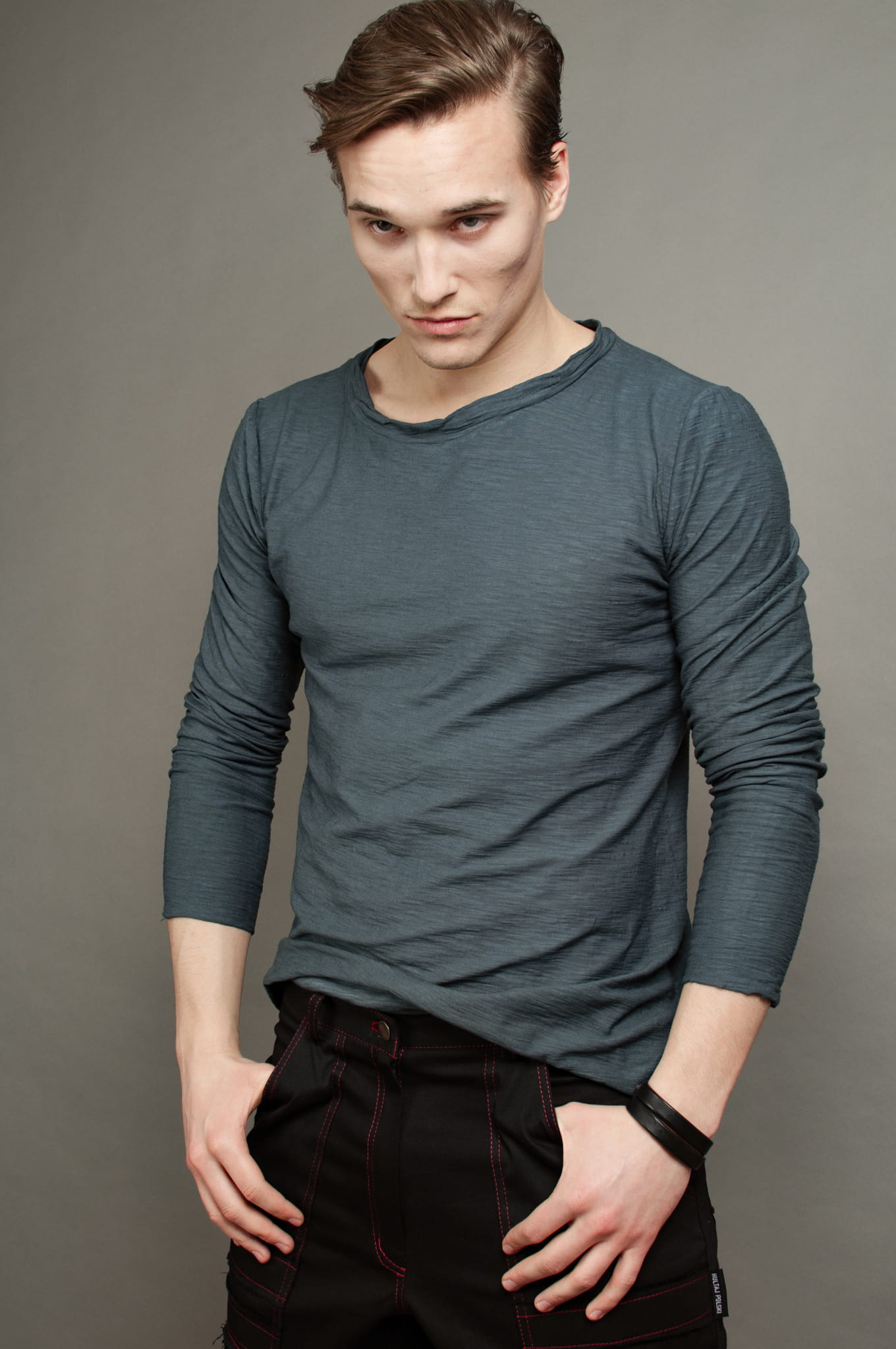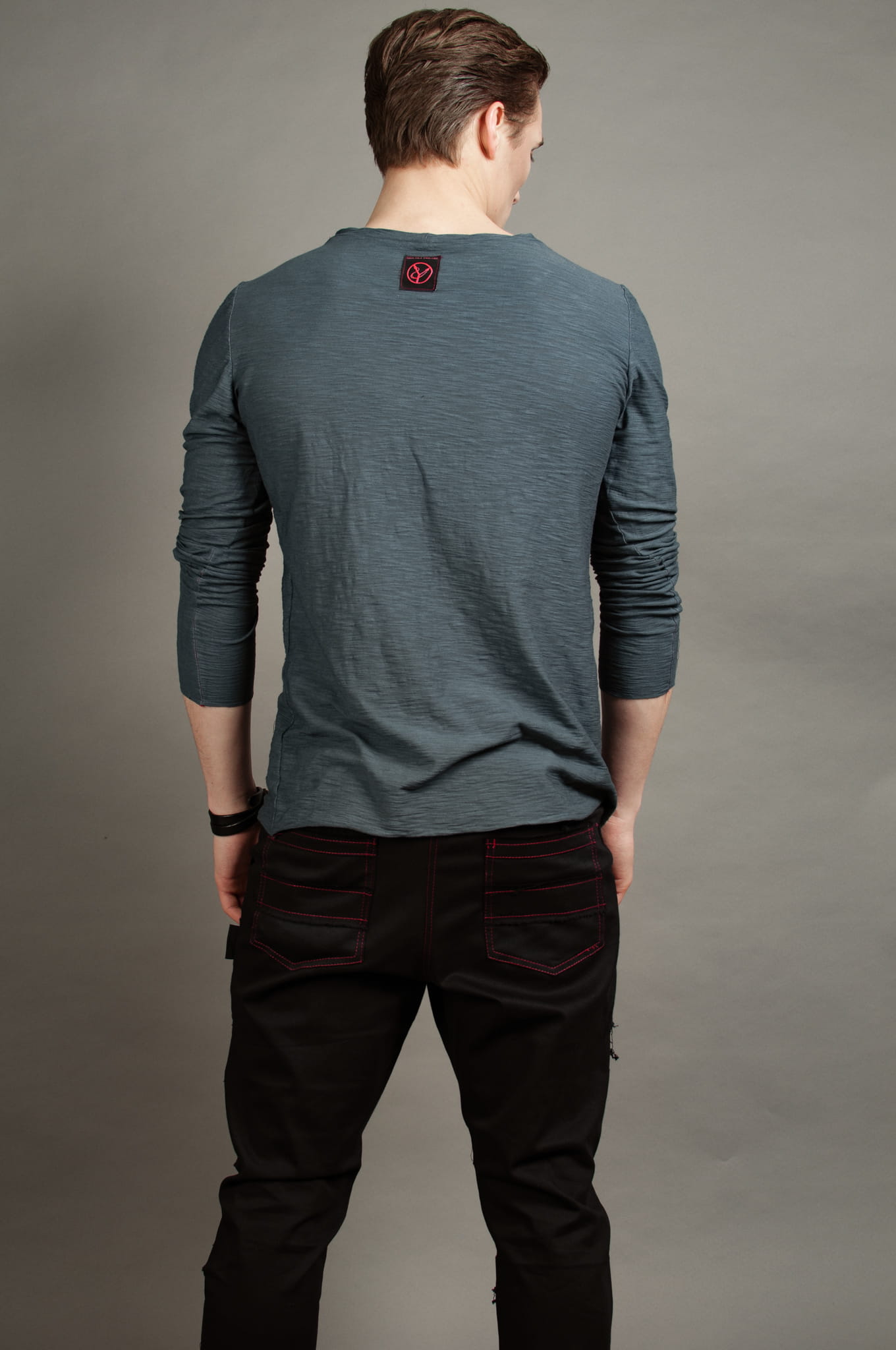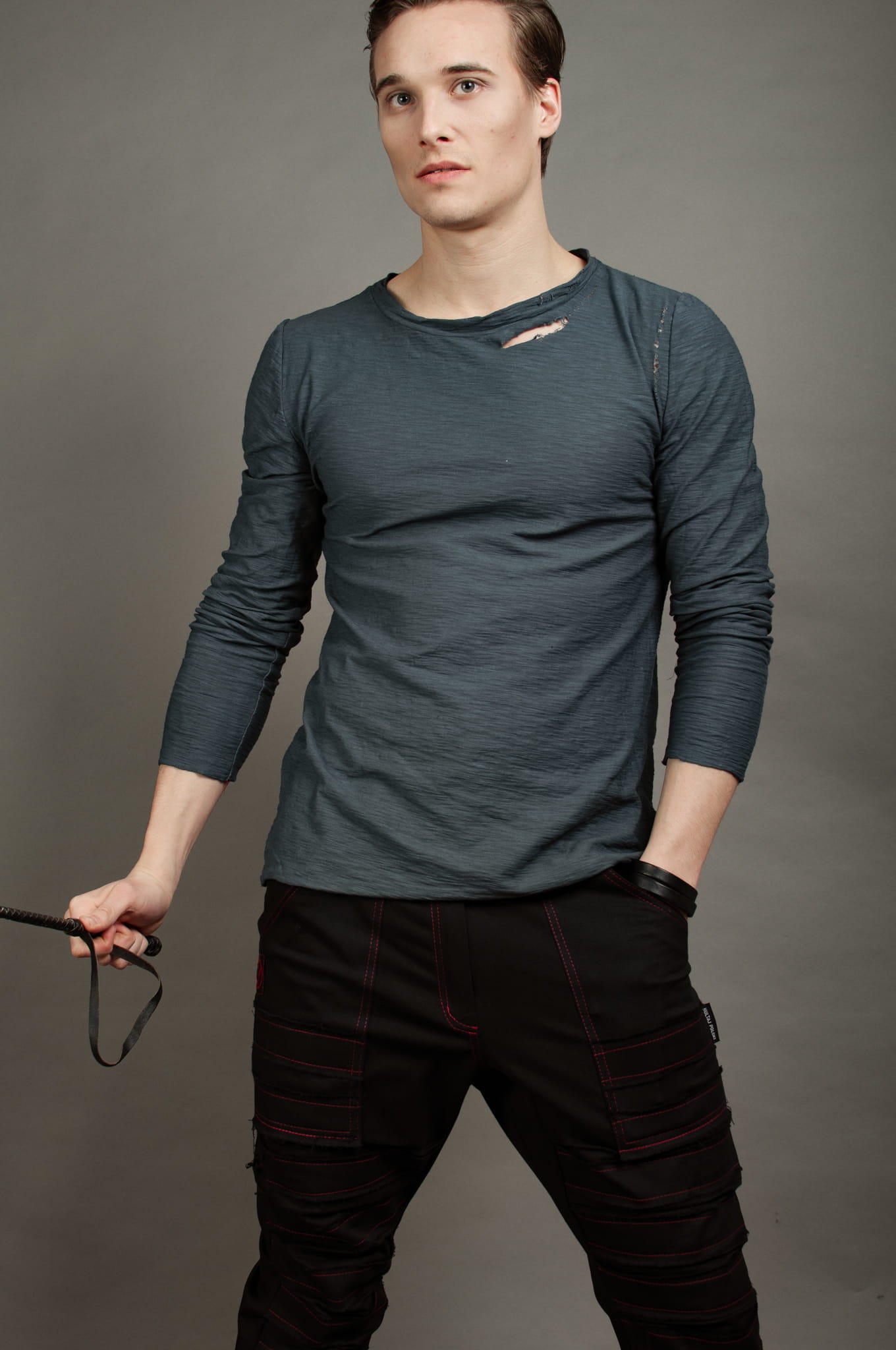 Prosto, ale z pazurem. Czerń łączona z czerwienią, mocny akcent w postaci dwóch rozdarć i czerwonych przeszyć. Dla niepokornych rebeliantów z dobrym gustem.