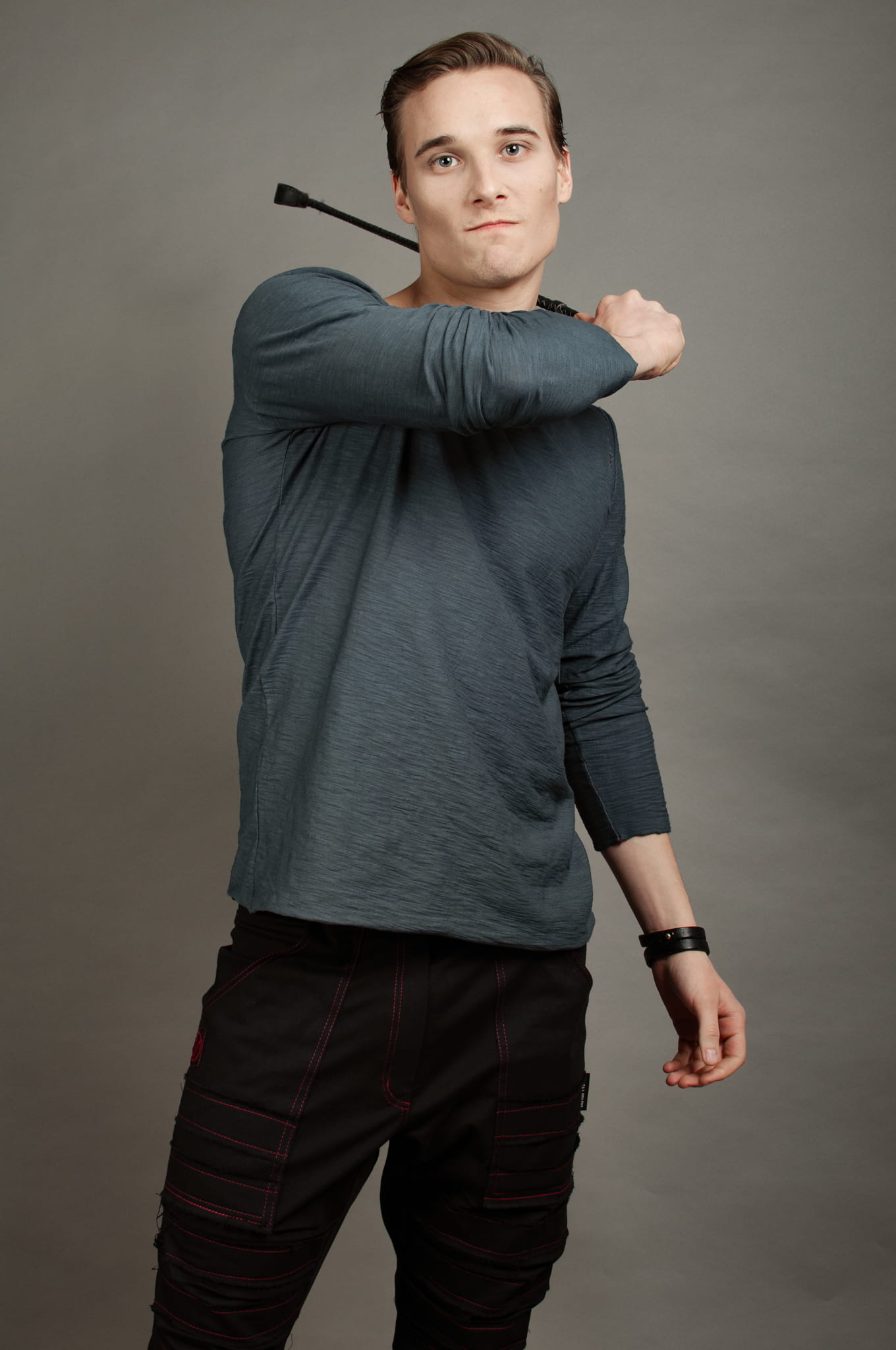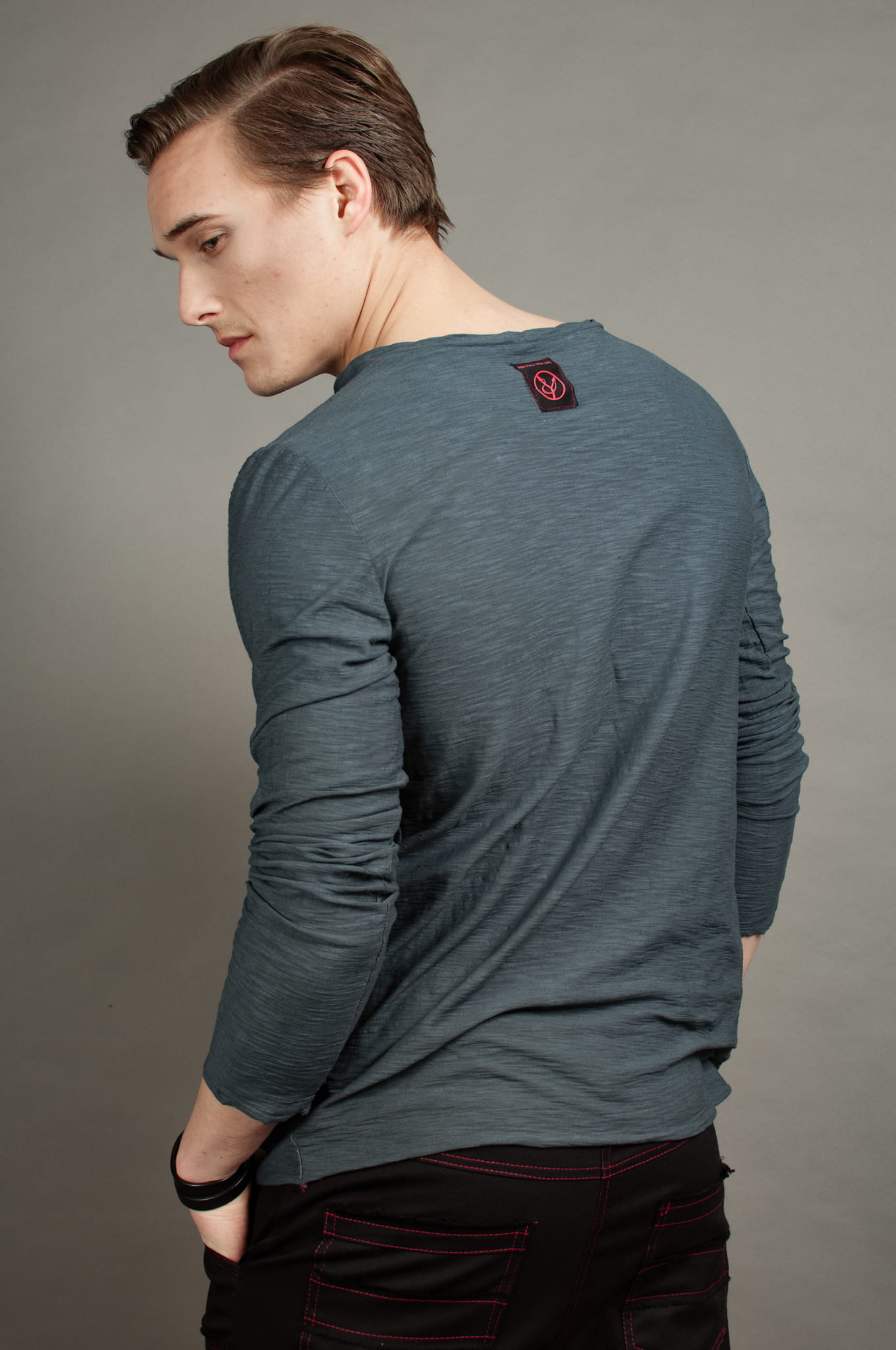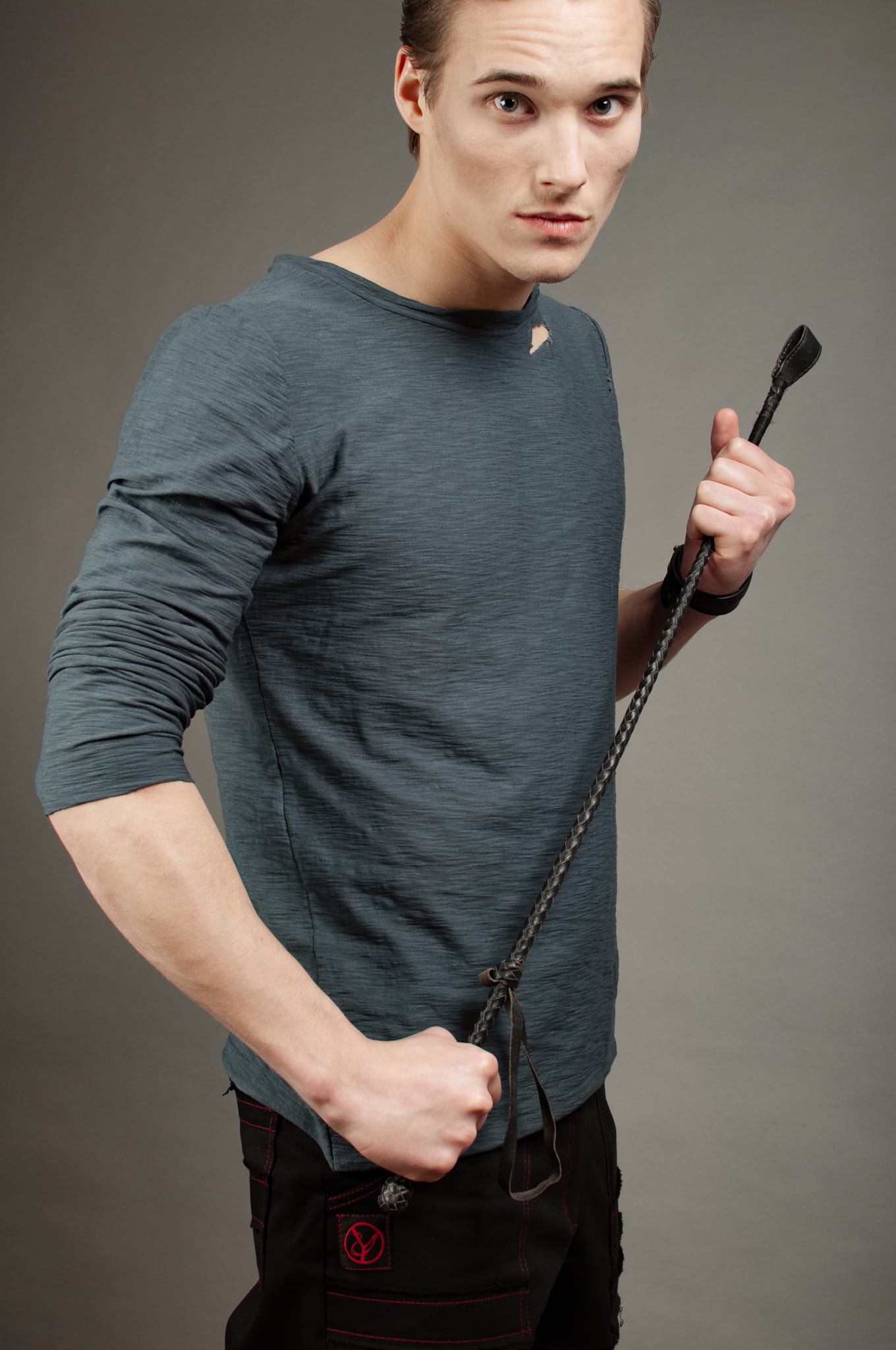 Prosto, ale z pazurem. Czerń łączona z czerwienią, mocny akcent w postaci dwóch rozdarć i czerwonych przeszyć. Dla niepokornych rebeliantów z dobrym gustem.
