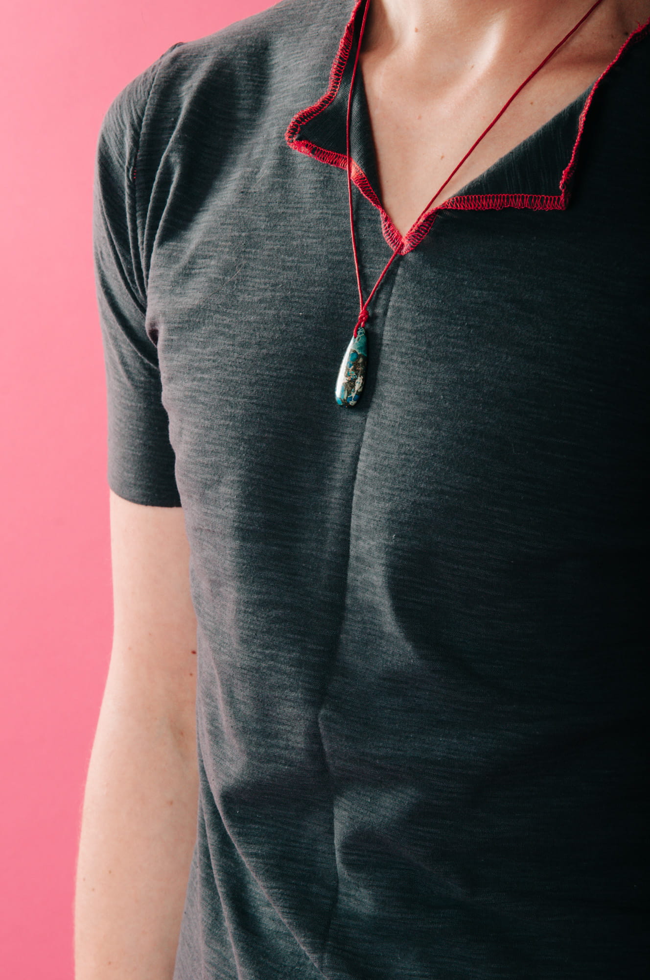 Możesz ją kupić również w wersji z wisiorkiem o wdzięcznej nazwie "O Co Kaman". Jest to jaspisowa łezka zawieszona na rzemyku w identycznym kolorze, jak czerwone wykończenia bluzki.