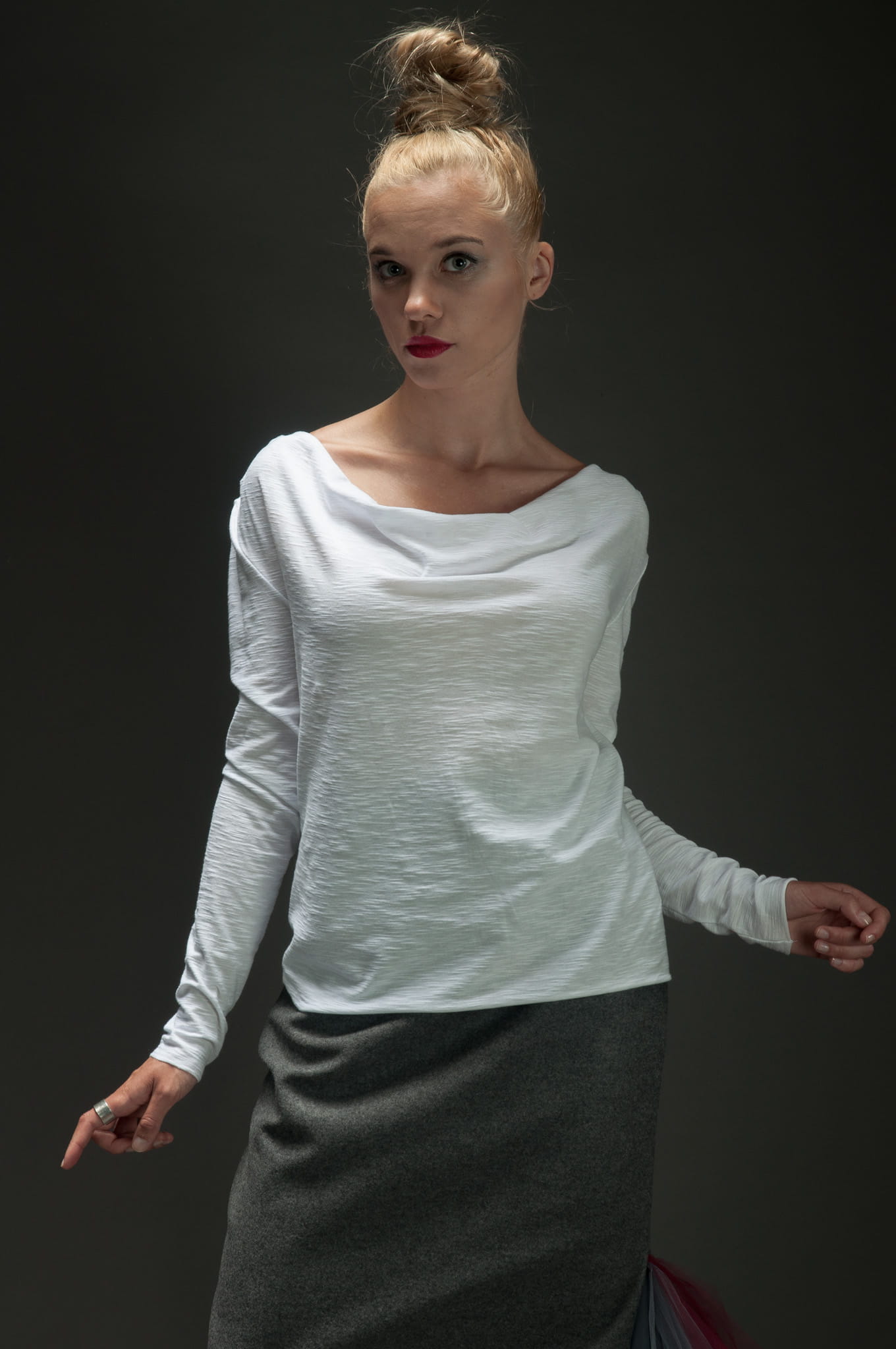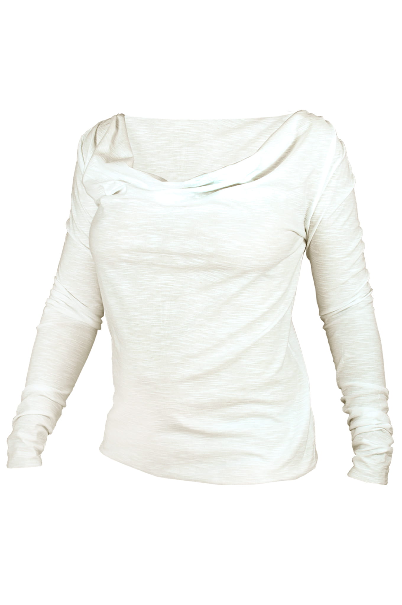 Lejący, szeroki dekolt typu „woda”, długi rękaw.