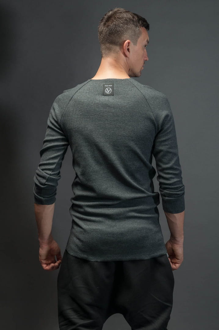 Bluzka Ściągaczowa Ciemnoszara Męska została wykonana z elastycznego bawełnianego ściągacza (92% bawełna, 8% elastan), który zachwyca super jakością i miękkością. Materiał w odcieniu ciemnoszarym – znanym też jako antracytowy, grafitowy czy stalowy – idealnie układa się na męskiej sylwetce, nie opinując ciała i zapewniając komfort przez cały dzień. Nieobrębione brzegi, które się nie strzępią, podkreślają nowatorski charakter tego ciemnoszarego longsleeve’a męskiego.