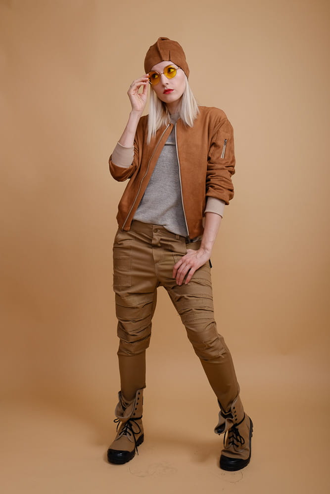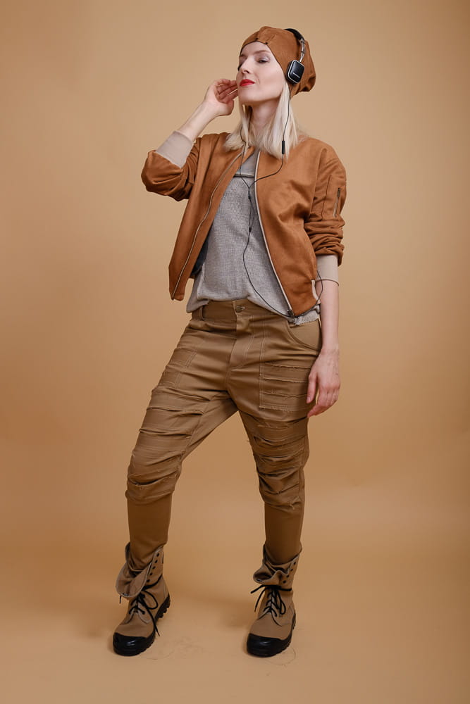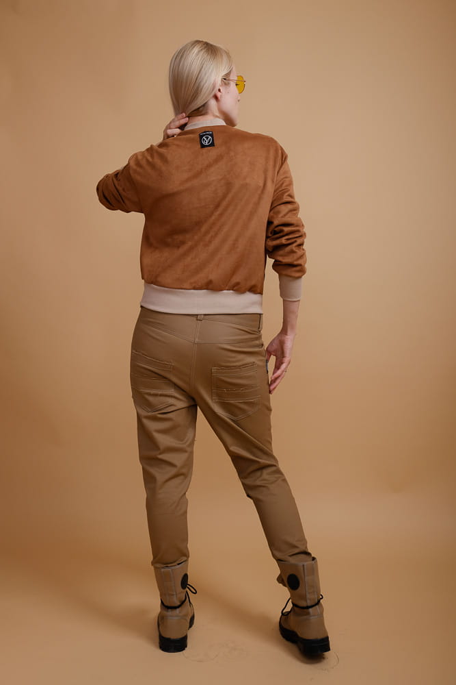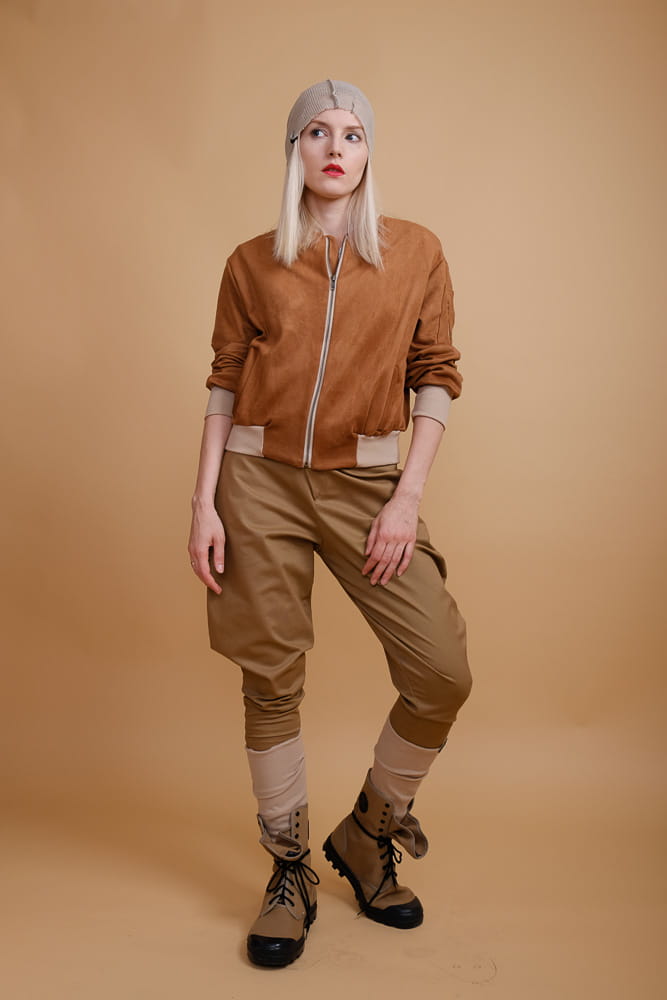 Lekka kurtka bomberka z dzianiny o strukturze zamszu. Zapinana na metalowy suwak w kolorze złotym. Kurtka jednowarstwowa. Znakomita na lato i na sezony przejściowe.