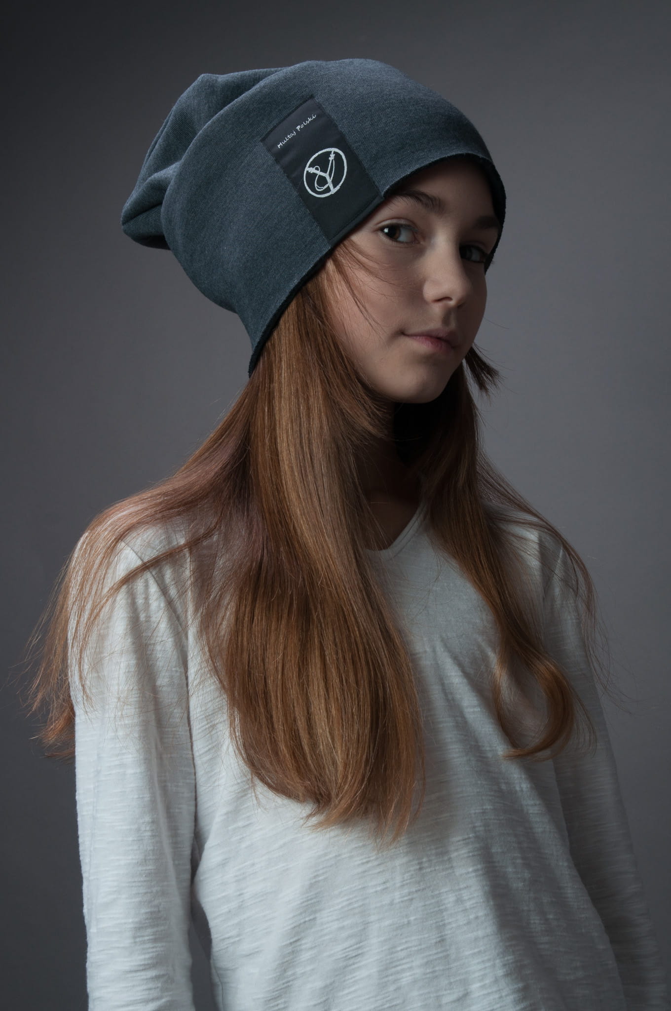 Ciepła szara czapka dziecięca z dzianiny dresowej.