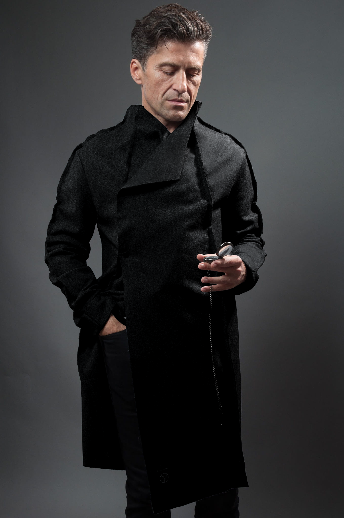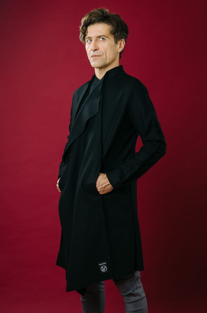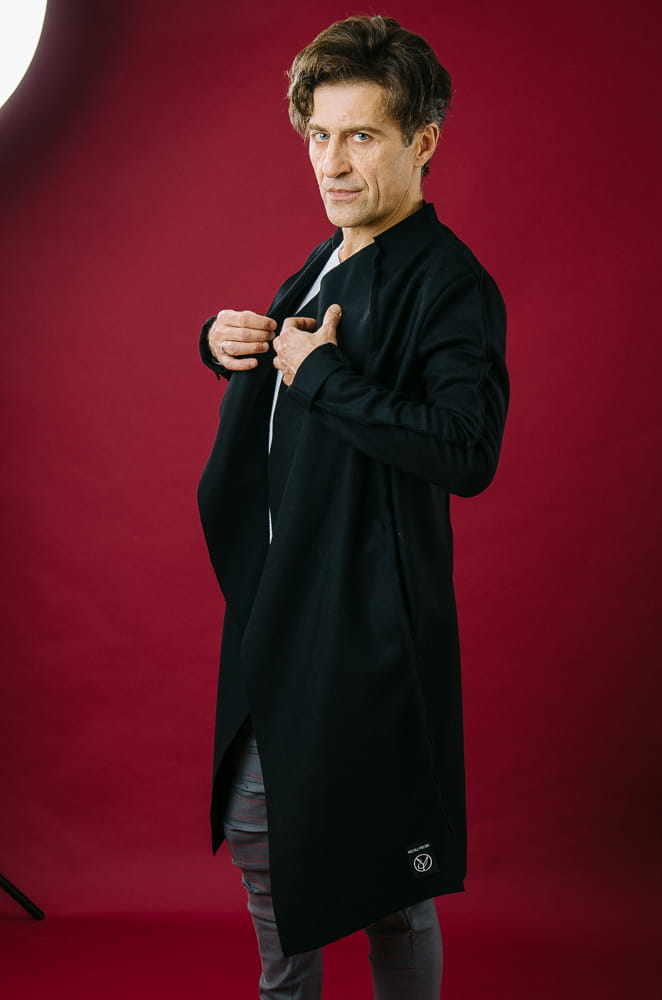 Czarny męski płaszcz z sukna na wiosnę i jesień.