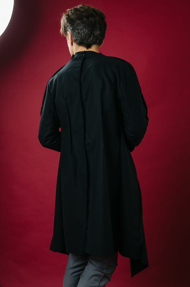 kołnierz. Zapina się na napy, po bokach dwie wewnętrzne kieszenie. Szwy płaszcza wypuszczone są na zewnątrz. Zawijane rękawy