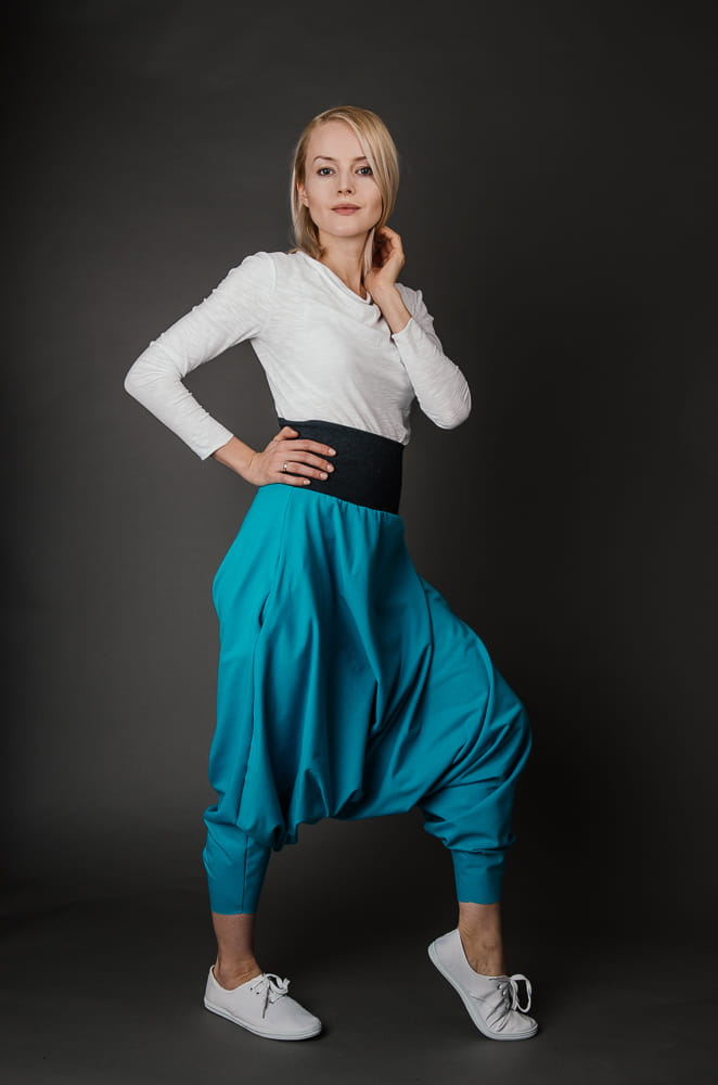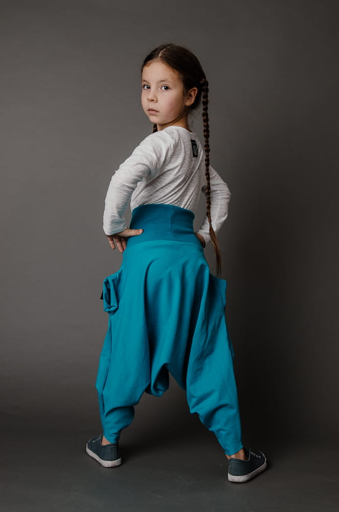 Turkusowe szarawary, znane także jako haremki, to idealna baza do świeżych, rodzinnych stylizacji: