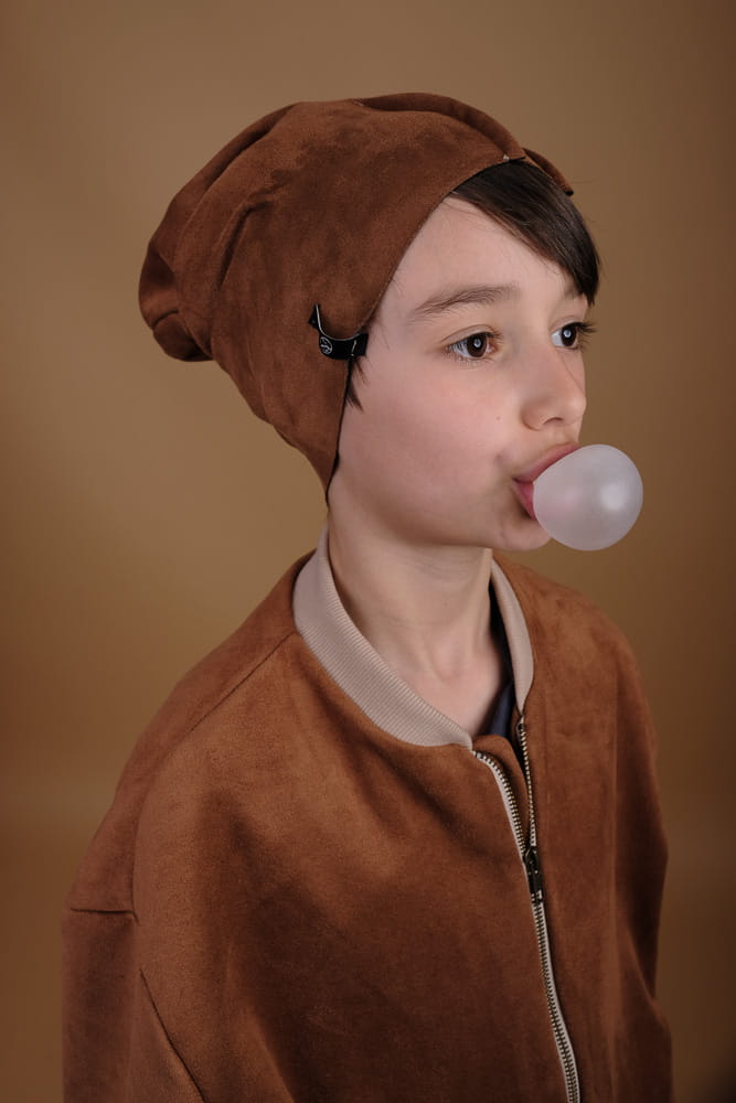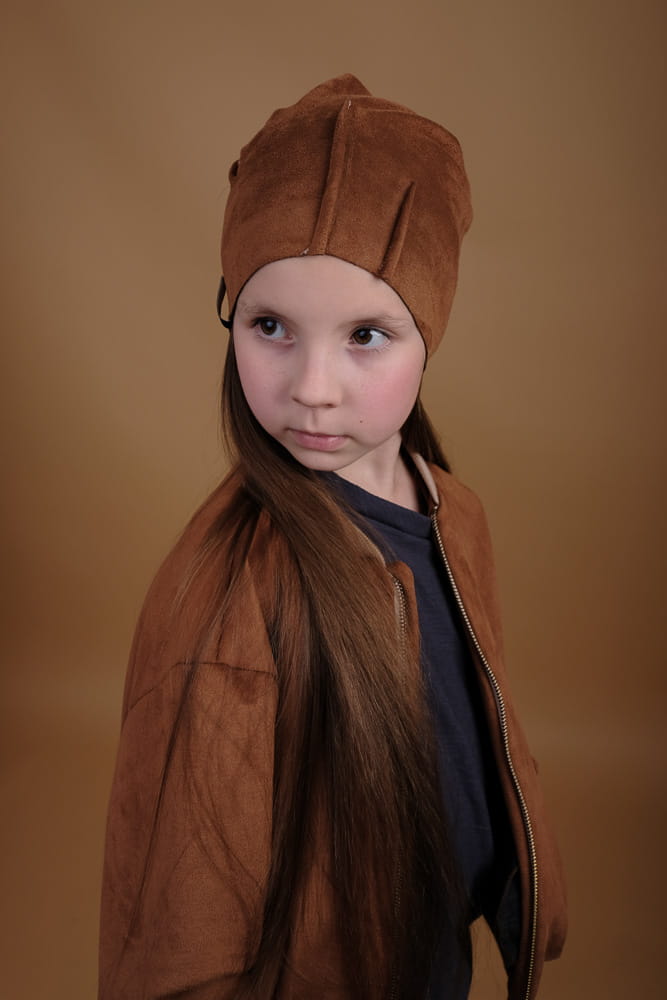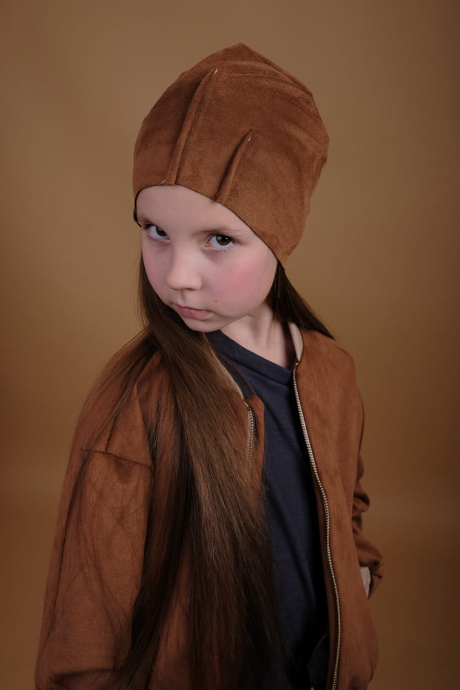 Czapka z przemiłej w dotyku, elastycznej dzianiny o strukturze zamszu. Asymetryczne przeszycia.