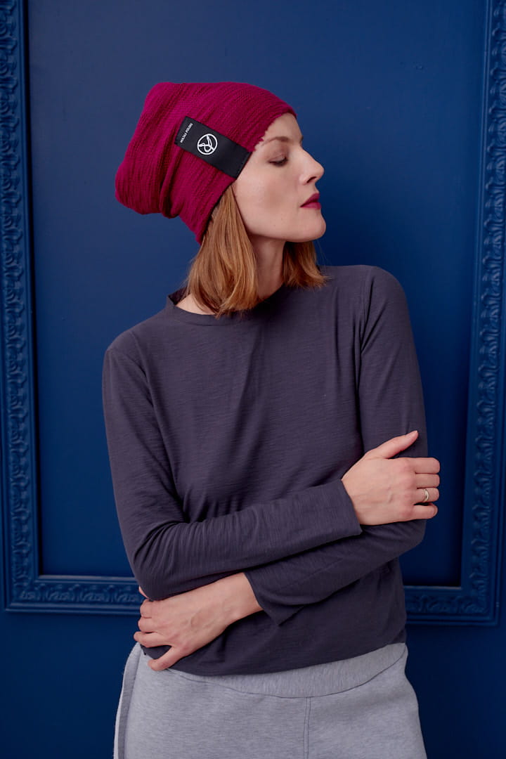 Czapka z wyjątkowo mięsistej, elastycznej dzianiny o splocie nieregularnego warkocza.
