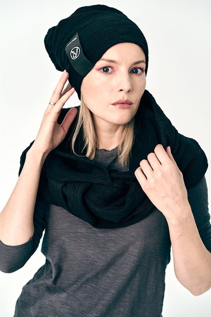 Czapka z wyjątkowo mięsistej, elastycznej dzianiny o splocie nieregularnego warkocza.