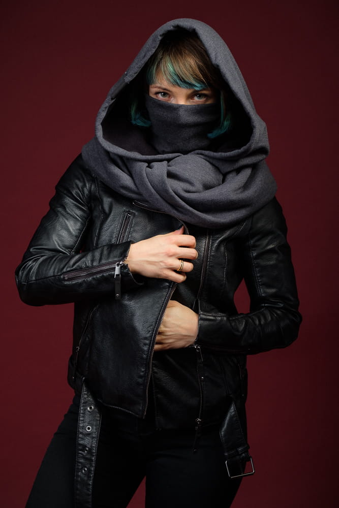 Ten polski kaptur damski ma wszytą osłonę na twarz w formie długiego golfa, który nie utrudnia oddychania. Można go zawinąć tak, aby osłaniał tylko szyję, a można go też rozwinąć tak, aby zasłaniał przed chłodem twarz, jak kominiarka.