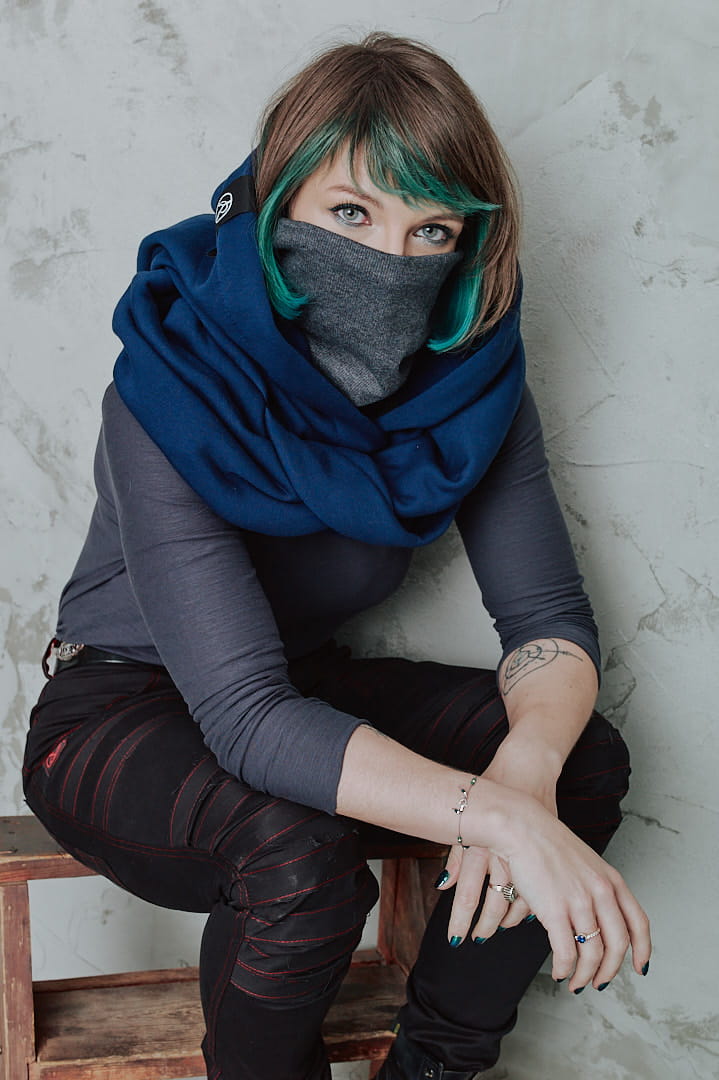 Ręcznie wykonany w warszawskich pracowniach, ten komin z kapturem granatowym z golfem zachwyca funkcjonalnością. Wbudowana osłona na twarz w formie granatowego golfa pozwala nosić go jako szalik lub rozwinąć jak kominiarkę, zapewniając swobodne oddychanie. Głęboki granatowy kolor dodaje klasy, pasując do wielu zimowych stylizacji.