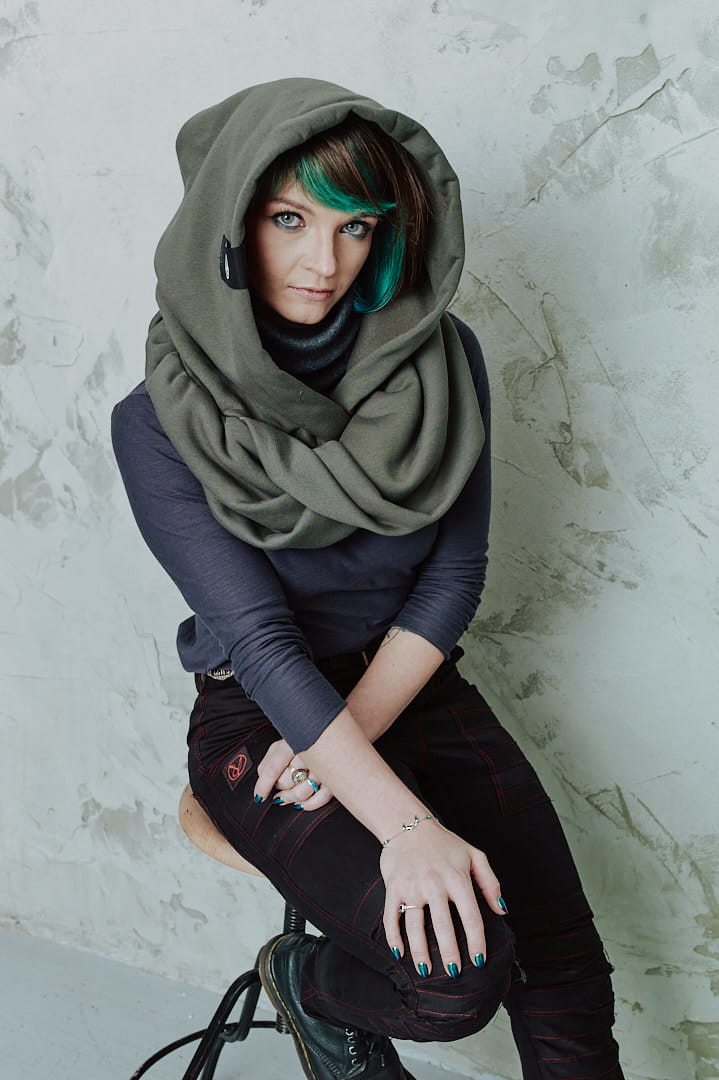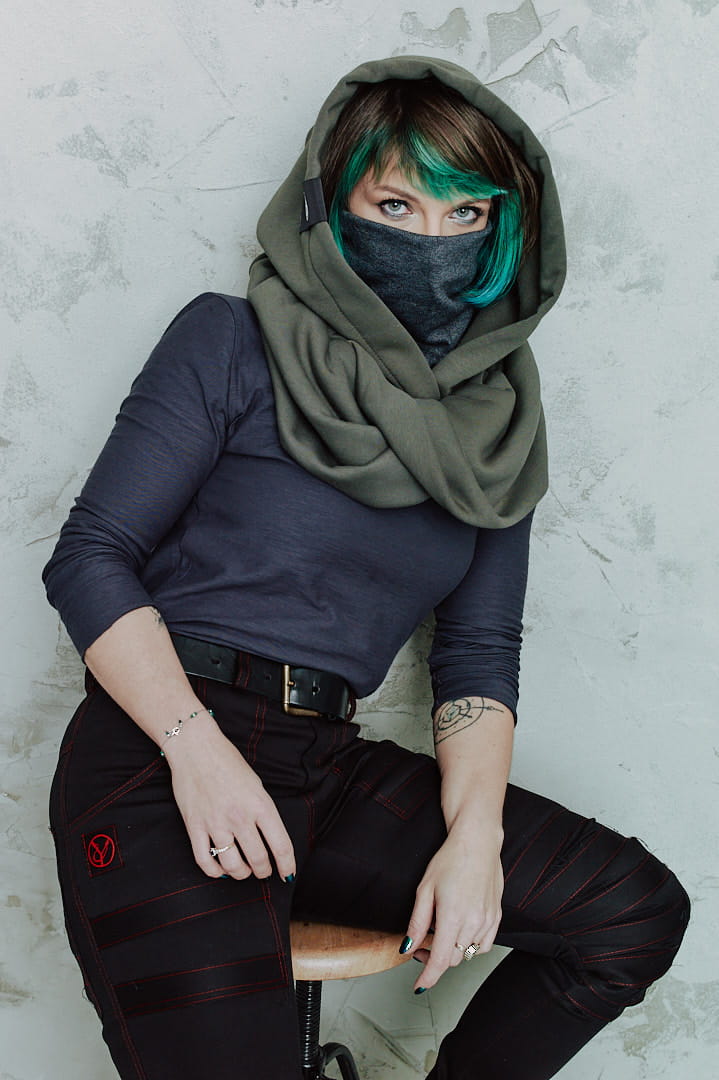 Ten polski kaptur damski powstaje w Polsce, w małych pracowniach krawieckich w Warszawie, z wysokiej jakości dzianiny khaki. Kaptur khaki z grafitowym golfem to gwarancja trwałości i unikalnego wyglądu. Wzór przemysłowy jest prawnie chroniony, a marka Hultajski Kaptur stawia na jakość.