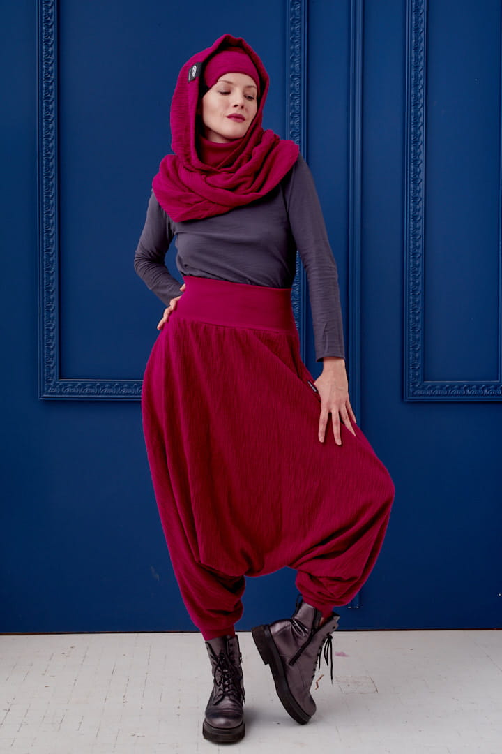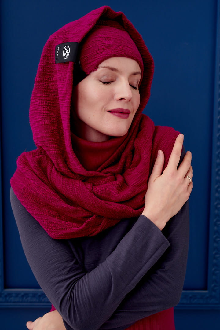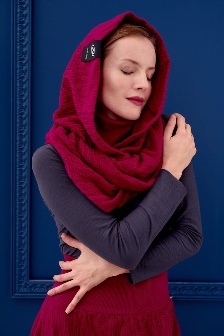 Dzianinowy szal z kapturem wykończony pod szyją ciepłym golfem. Kolor Kaptura to bordo. Kolor golfa - bordo.
