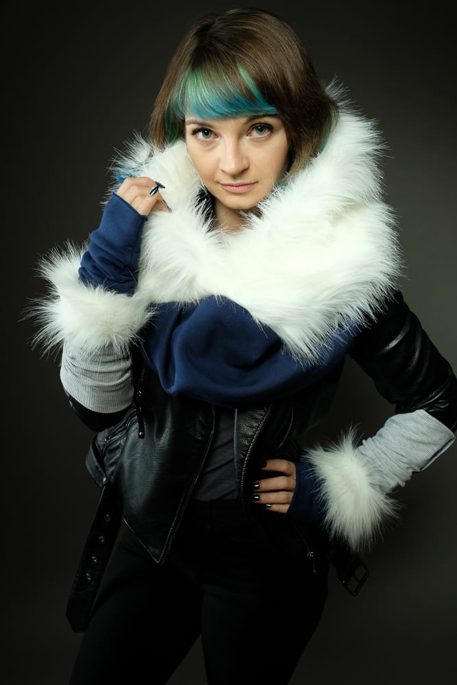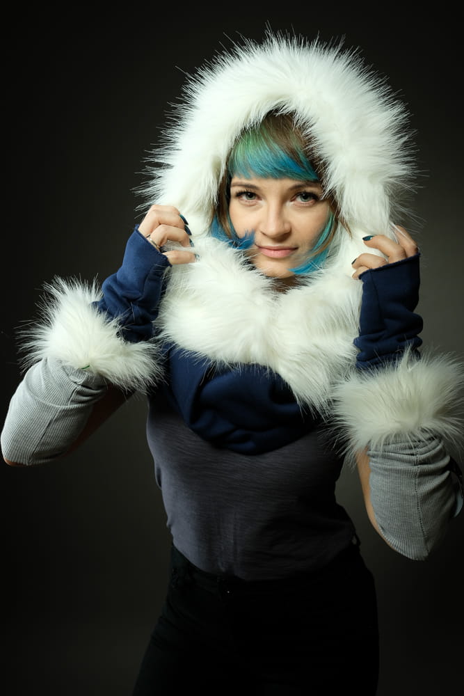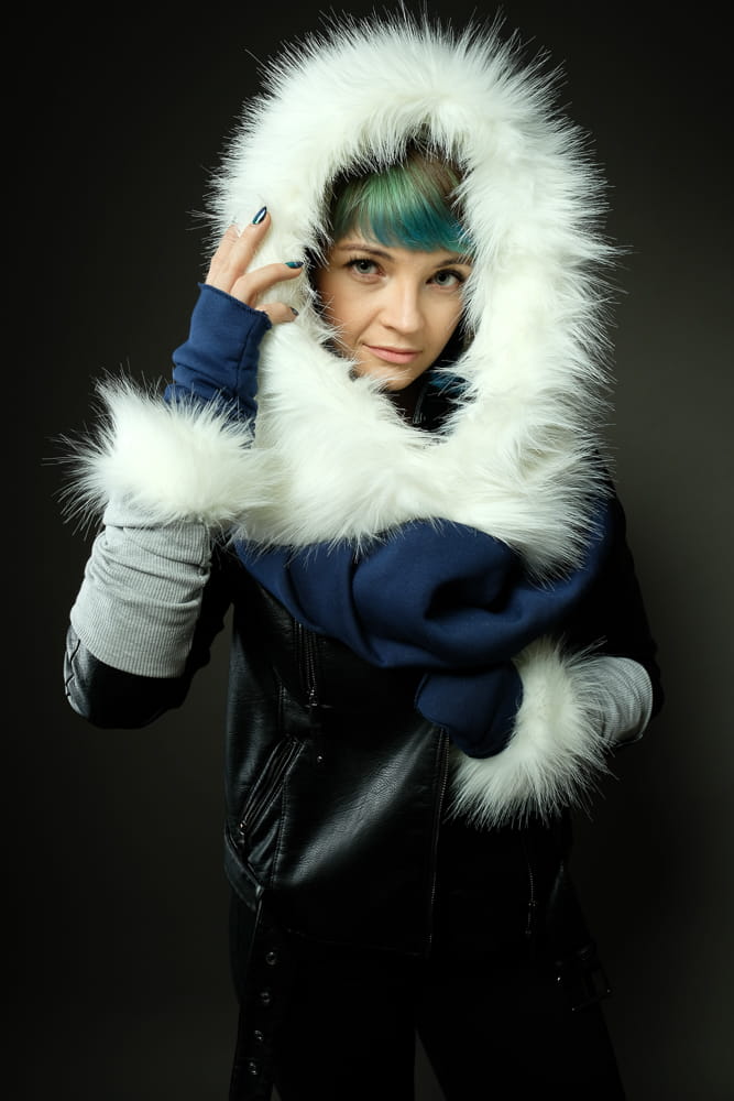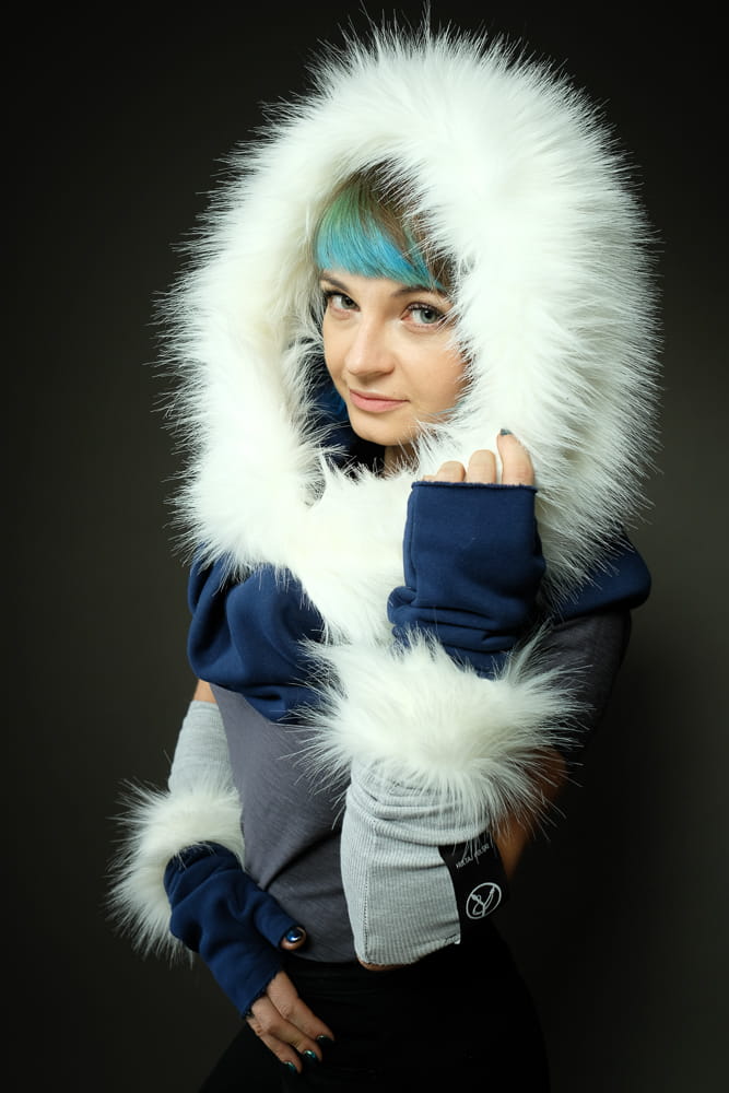 Granatowy Kaptur został obszyty szerokim pasem sztucznego śnieżnobiałego futra. Dzięki temu zyskał zupełnie nową jakość – dużo lepiej chroni przed chłodem i nabiera szyku odpowiedniego nawet na sienkiewiczowskie kuligi.