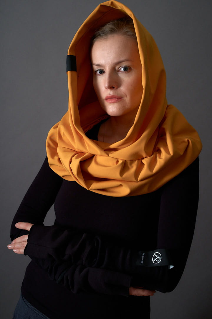 Miodowy kolor to hit dla odważnych – idealny jako coś, co zastąpi płaszcz przeciwdeszczowy! Na szczuplejszych sylwetkach opada na ramiona, osłaniając je przed wilgocią, a na szerszych układa się jak klasyczny szal – zero krępowania ruchów! Ten komin z kapturem pasuje do wszystkiego – od sportowej kurtki po elegancki płaszcz.