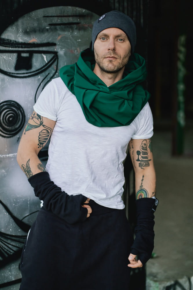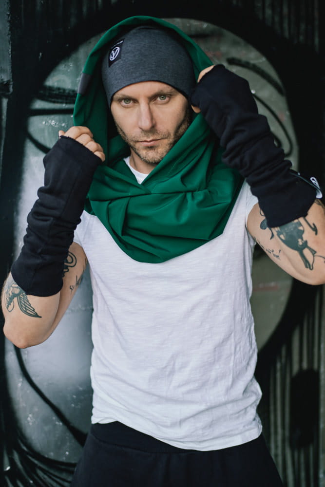 Zielony Kaptur Hydrofobowy Męski od Hultaja Polskiego – przeciwdeszczowy Komin z Kapturem. Praktyczny, minimalistyczny, idealny na deszcz dla mężczyzn i kobiet.