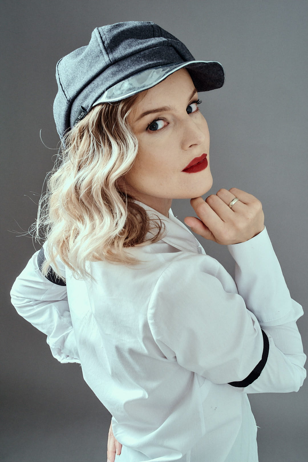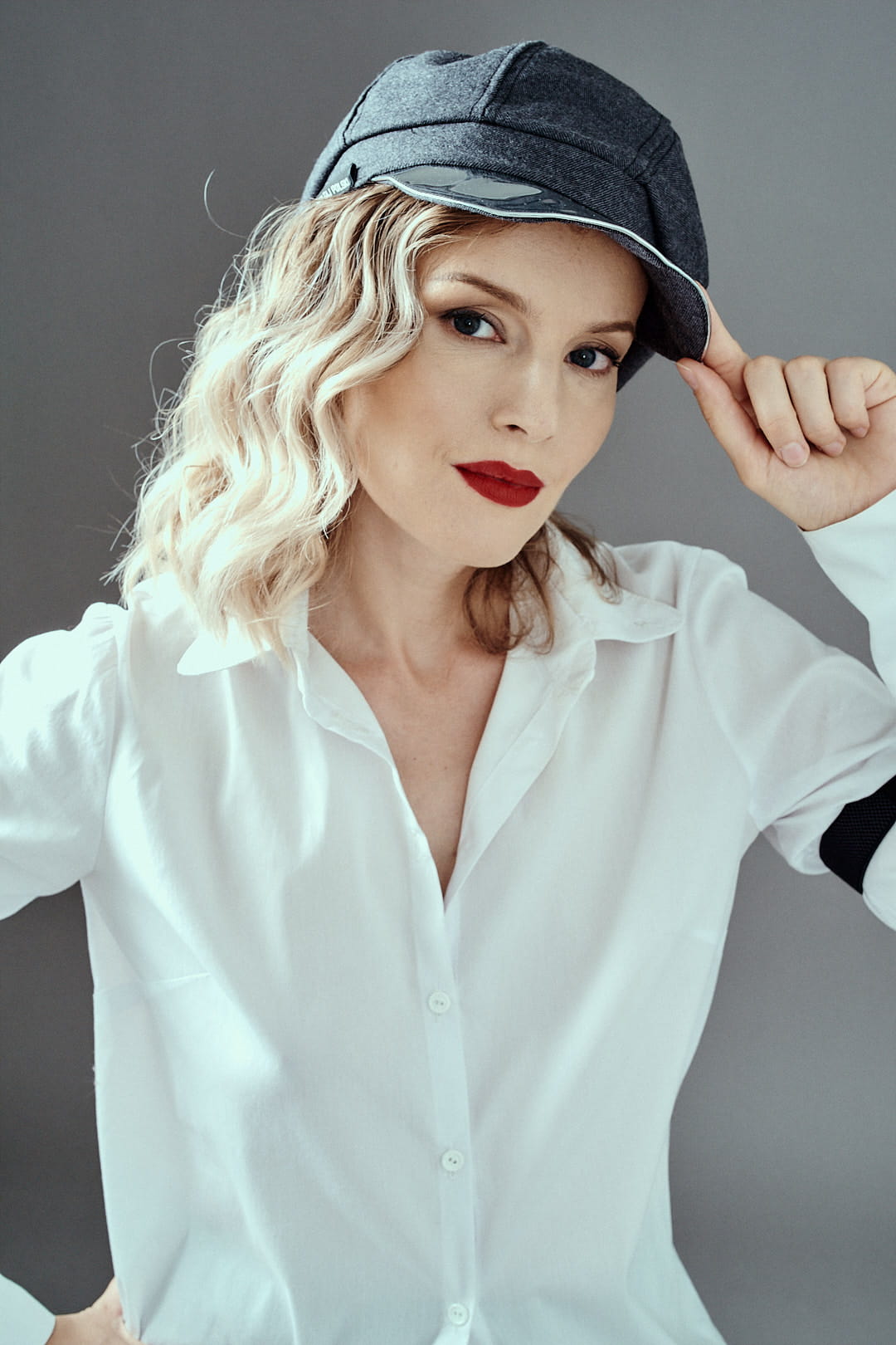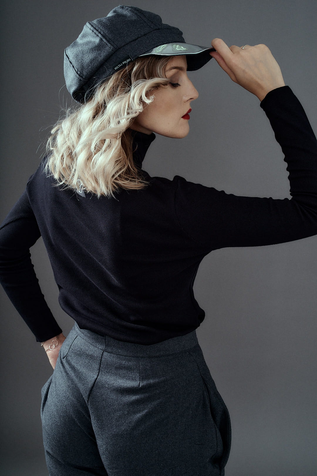 Niecodzienny kaszkiet z lusterkowym daszkiem. Uszyty jest z eleganckiej, szarej wełny garniturowej, a daszek zrobiliśmy z nietypowej tkaniny lustrzanej. Nie jest usztywniany, tak żeby można było go ugniatać i wyginać zgodnie z życzeniem.