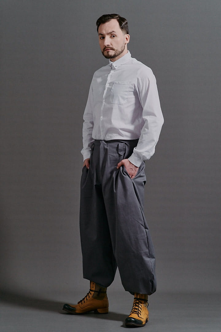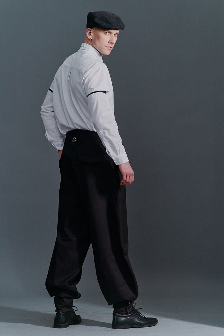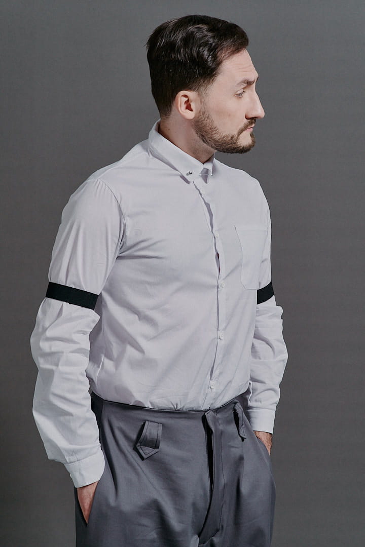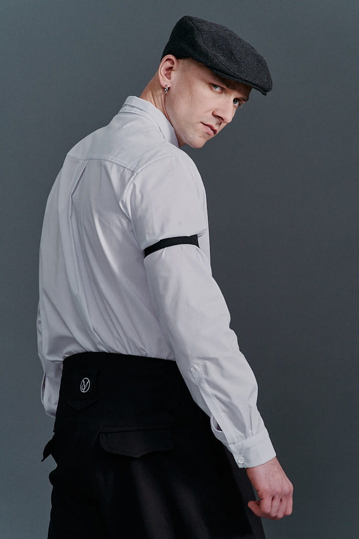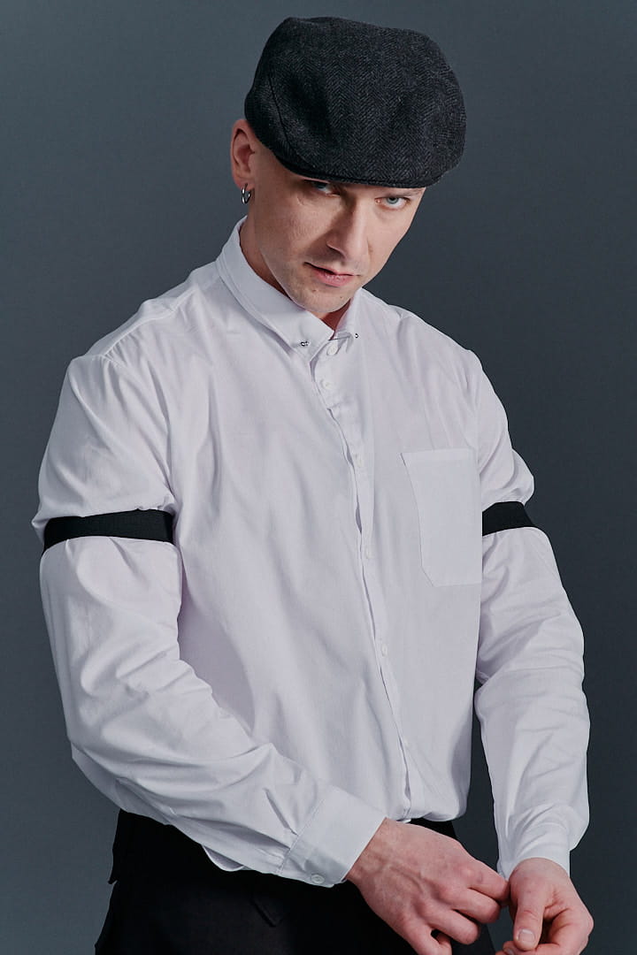 Ręcznie szyta biała koszula męska ze szpilką od Hultaj Polski – perfekcyjna do spodni Cwaniaków. Z dziurkami na elegancką szpilkę koszulową (w zestawie), w stylu lat 30. Dodaj opaski na rękawy lub szelki – sprawdź dodatki! Tkanina: 97% bawełna, 3% elastan. Napisz, a dostosujemy rozmiar!