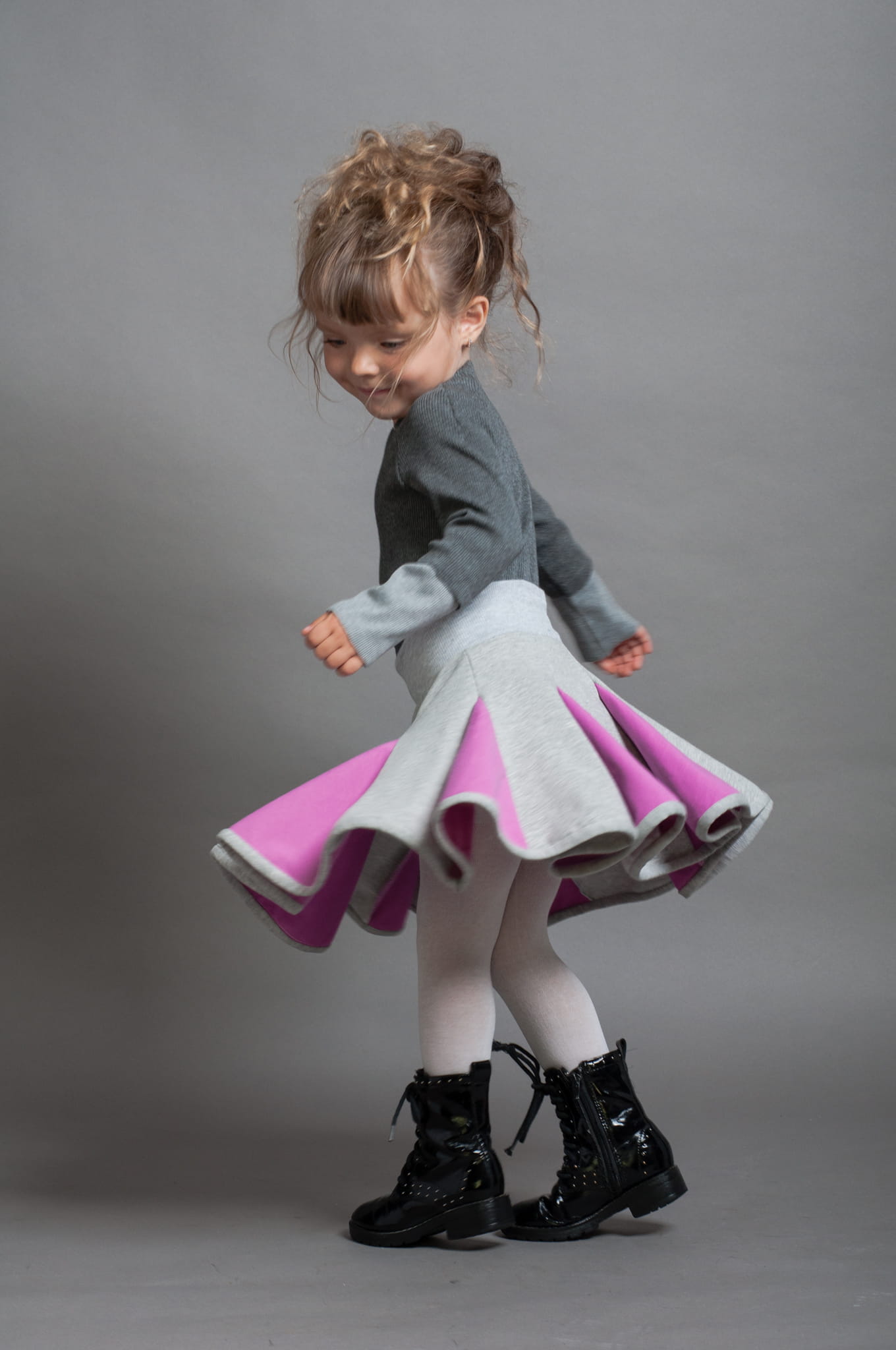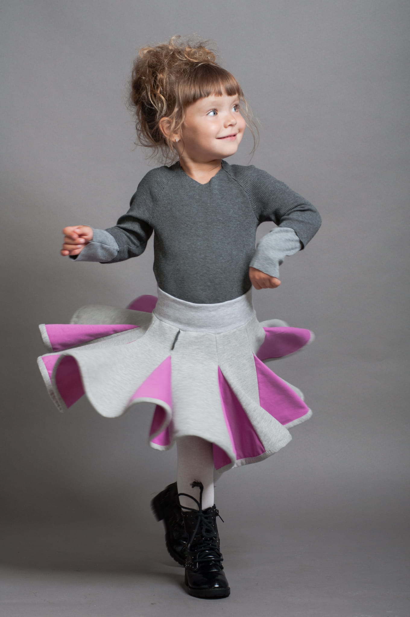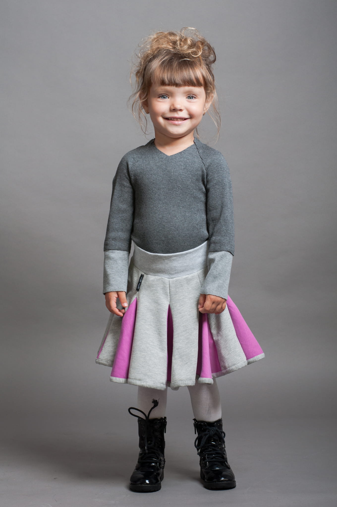 Krótka spódniczka bawełniana uszyta z klinów. W pasie ma miękki ściągacz, dół spódniczki wykończony jest lamówką. Dominujący szary kolor został ożywiony dzięki kolorowym wstawkom.