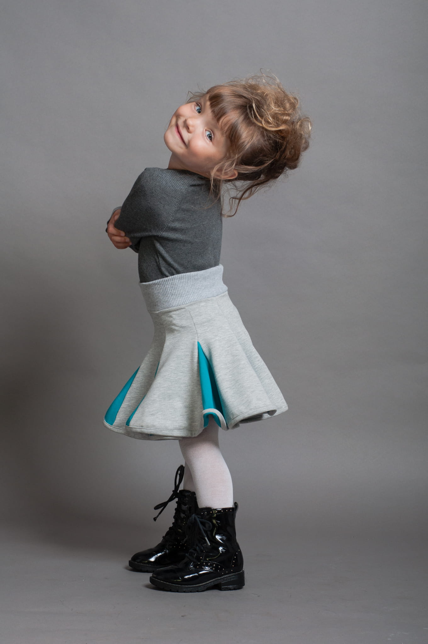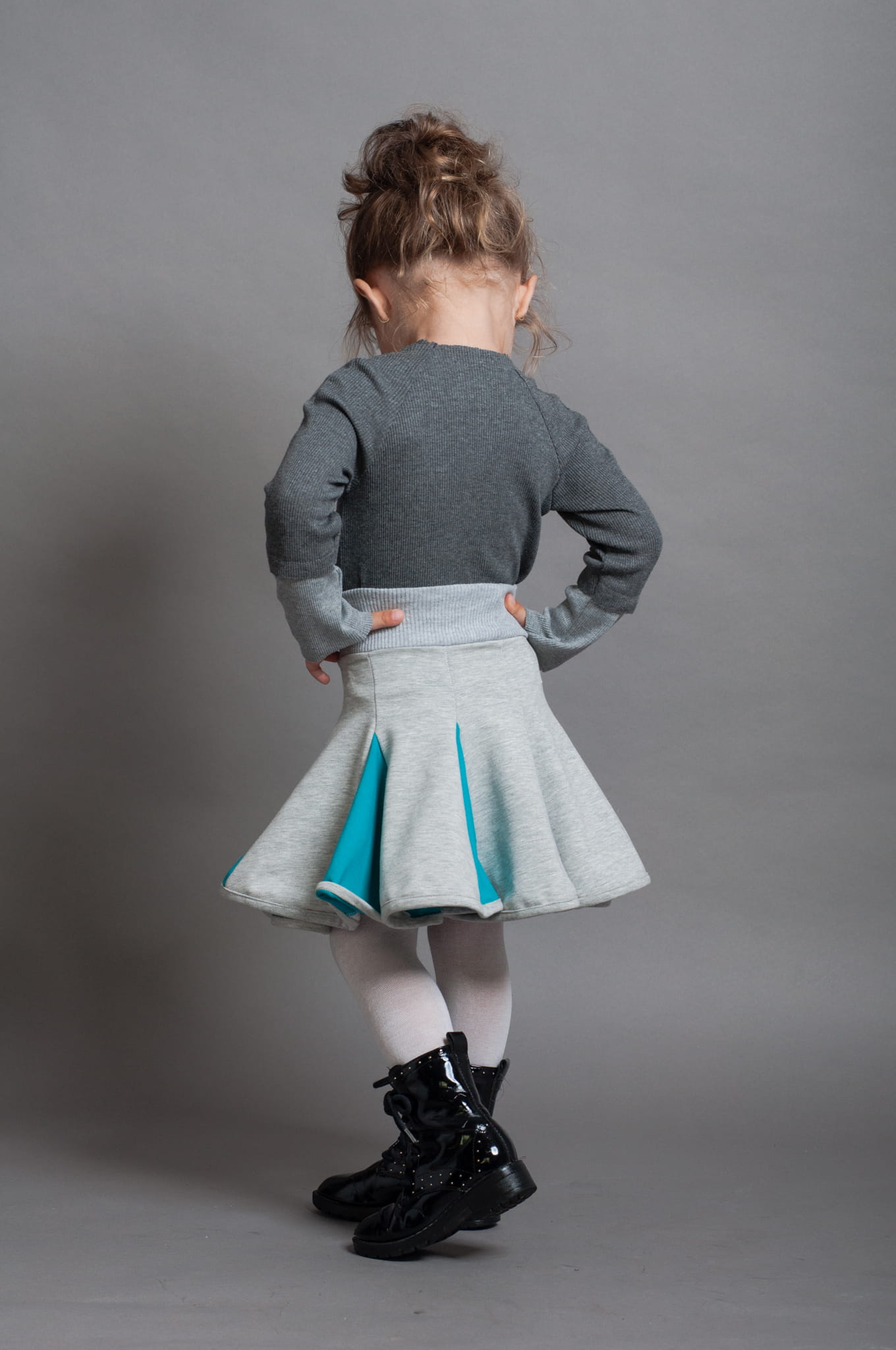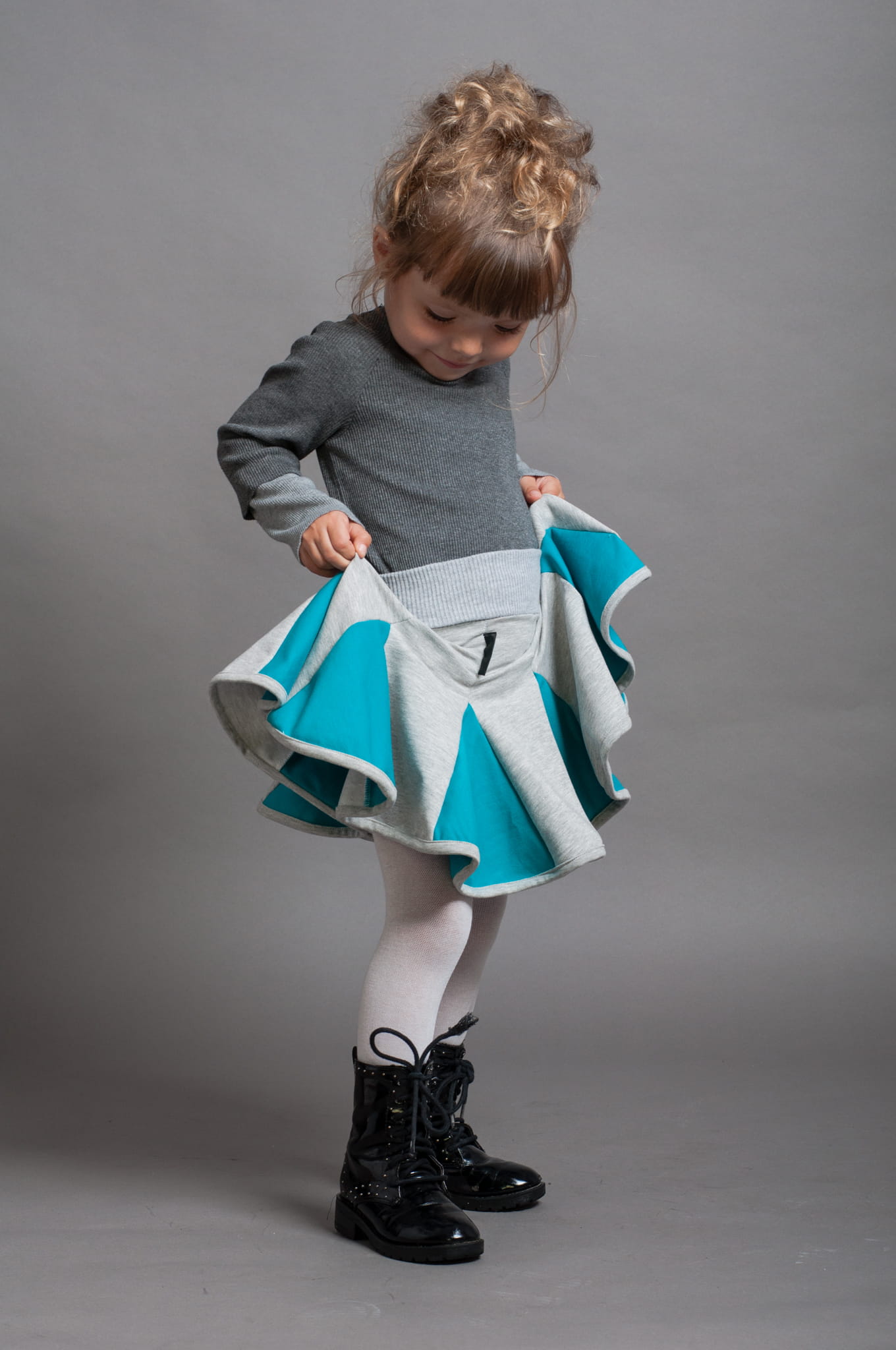 Krótka spódniczka bawełniana uszyta z klinów. W pasie ma miękki ściągacz, dół spódniczki wykończony jest lamówką. Dominujący szary kolor został ożywiony dzięki kolorowym wstawkom.
