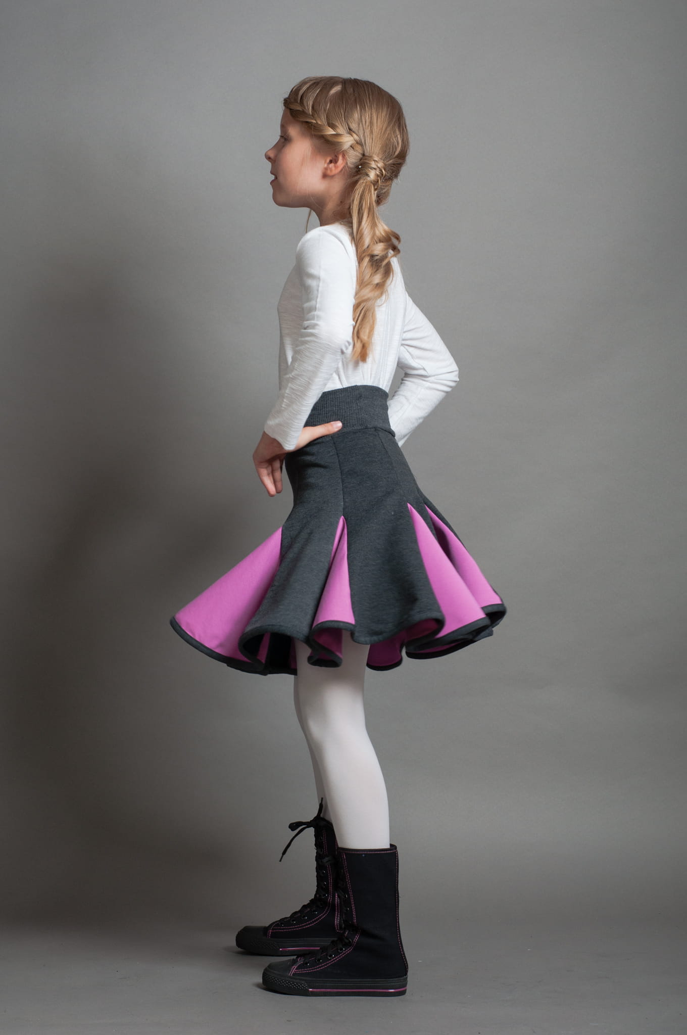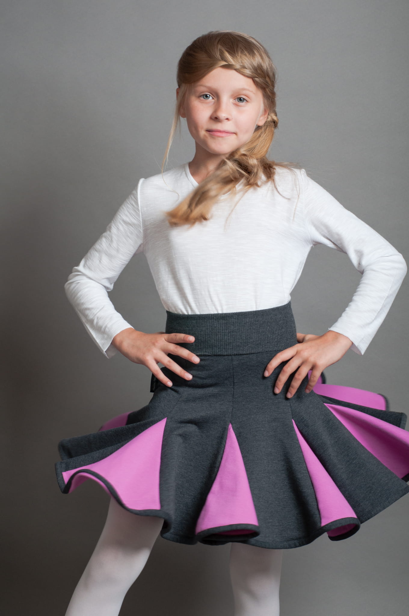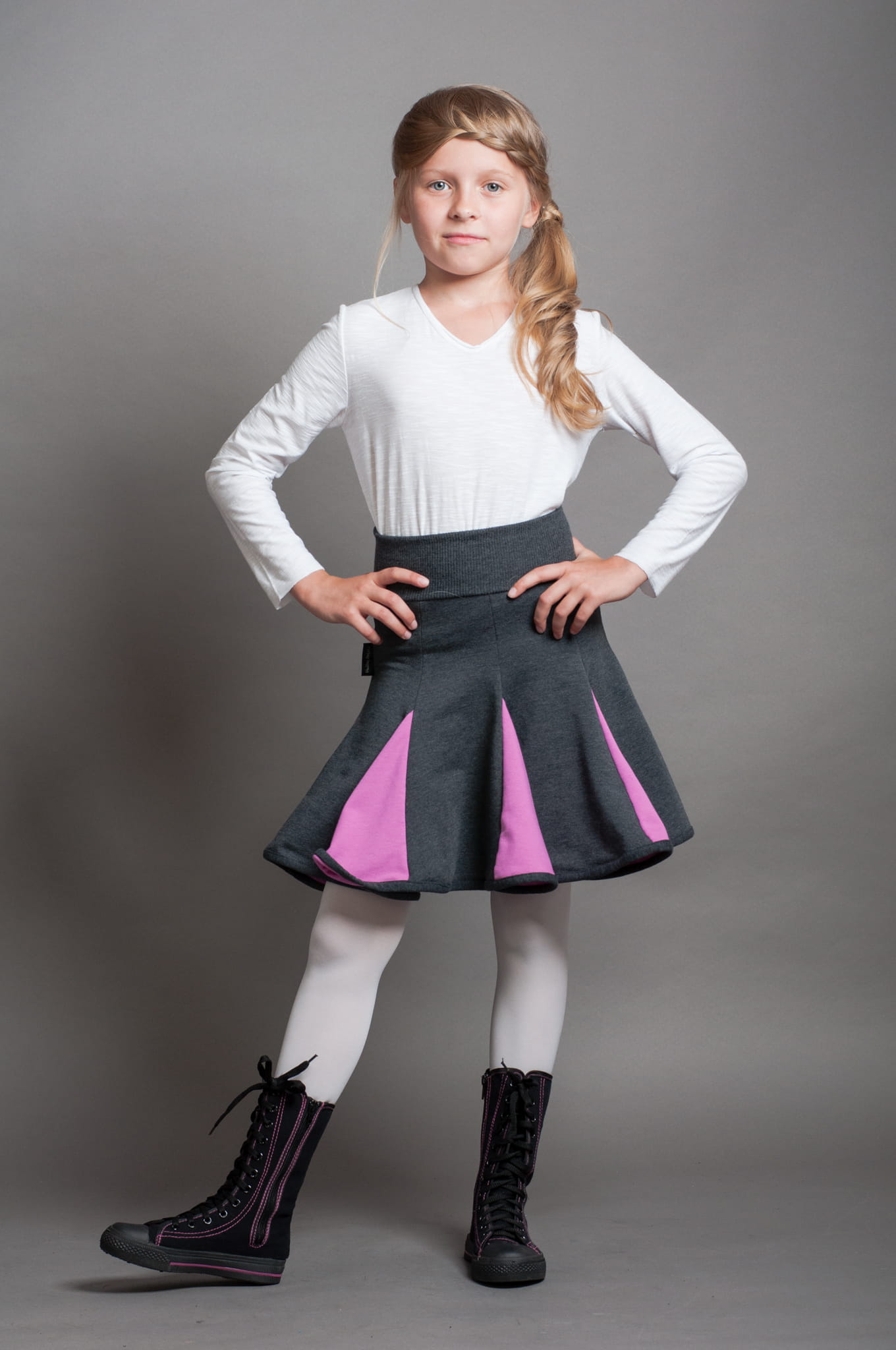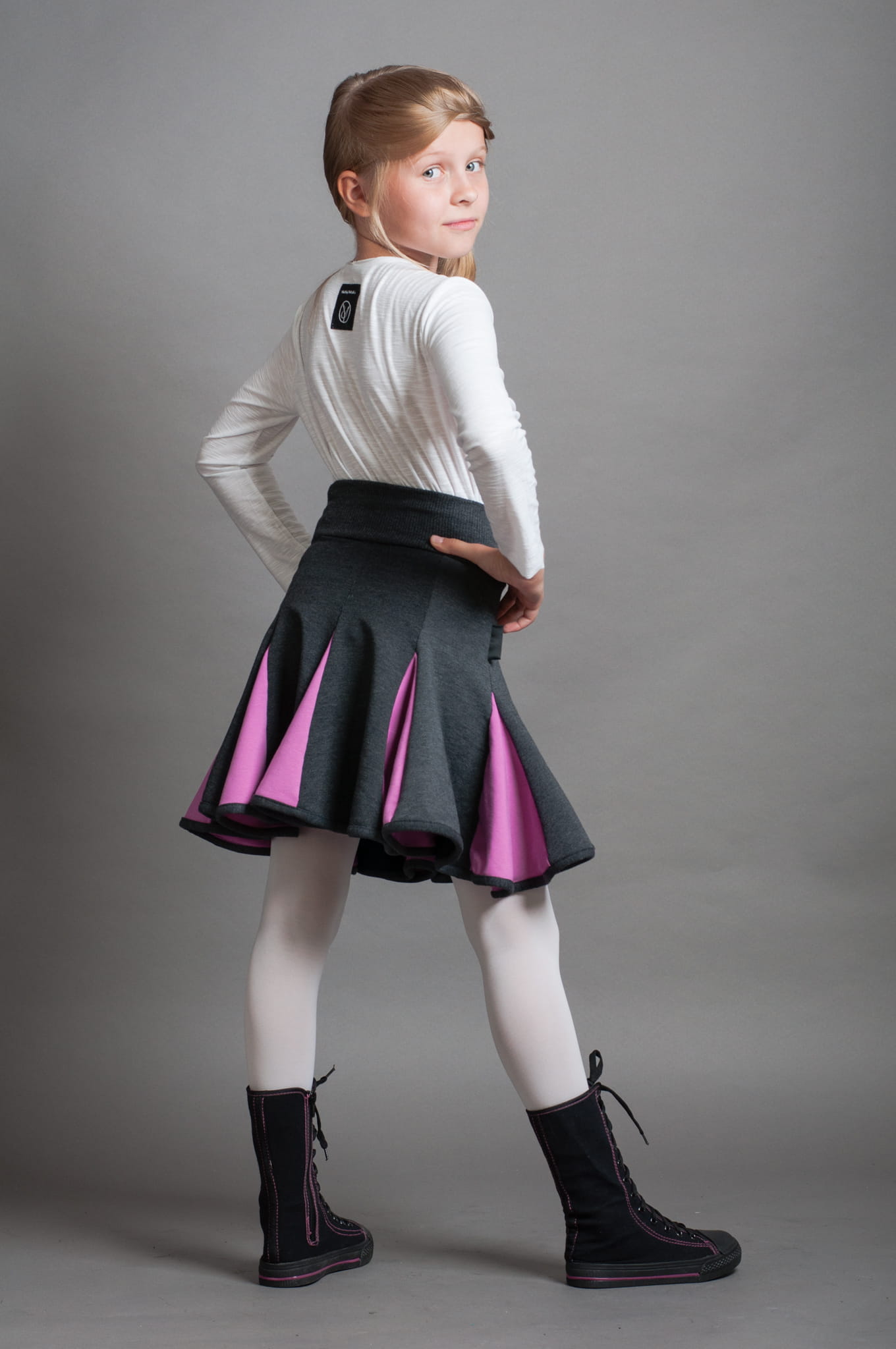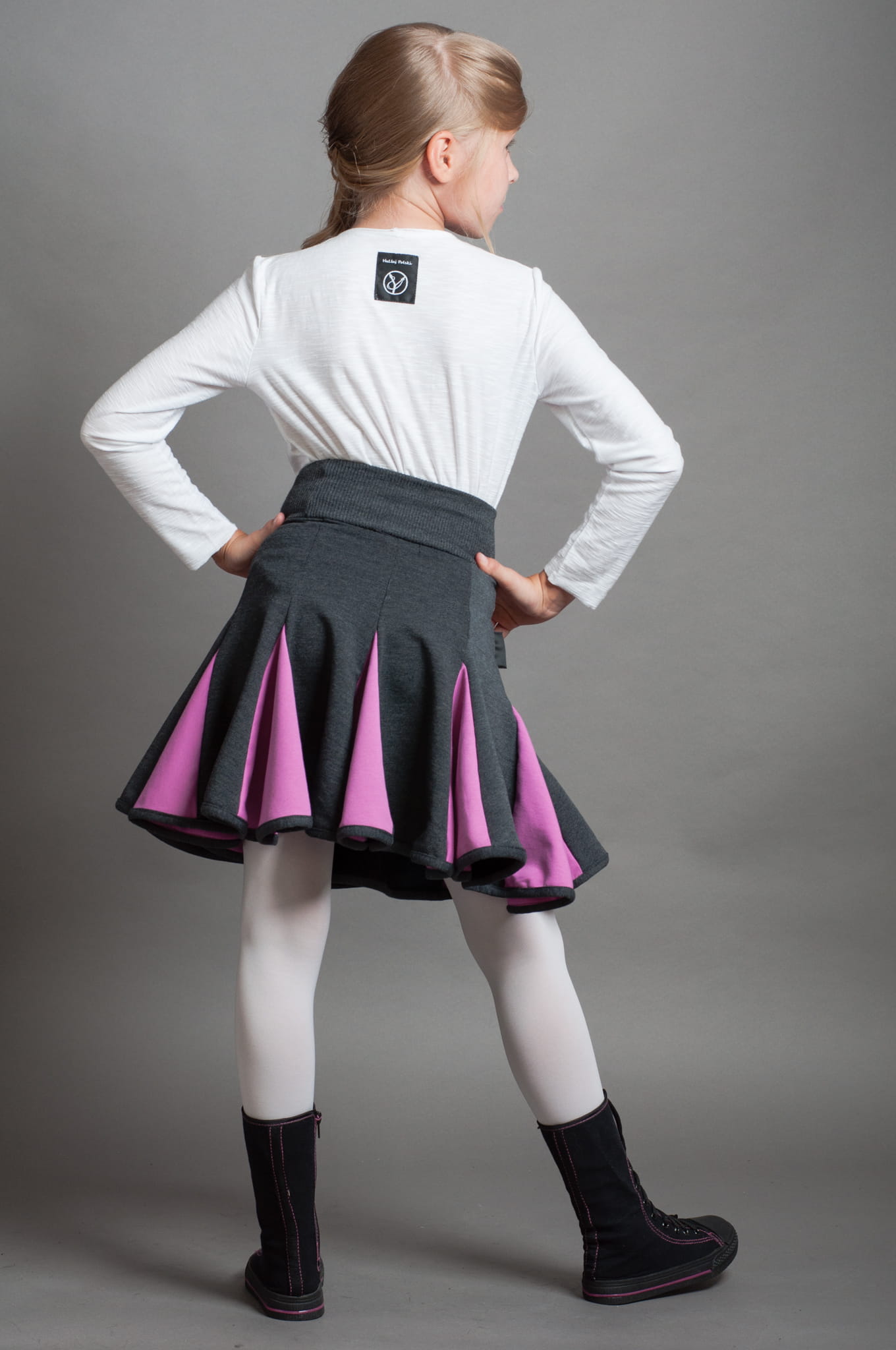 Krótka spódniczka bawełniana uszyta z klinów. W pasie ma miękki ściągacz, dół spódniczki wykończony jest lamówką. Dominujący szary kolor został ożywiony dzięki kolorowym wstawkom.
