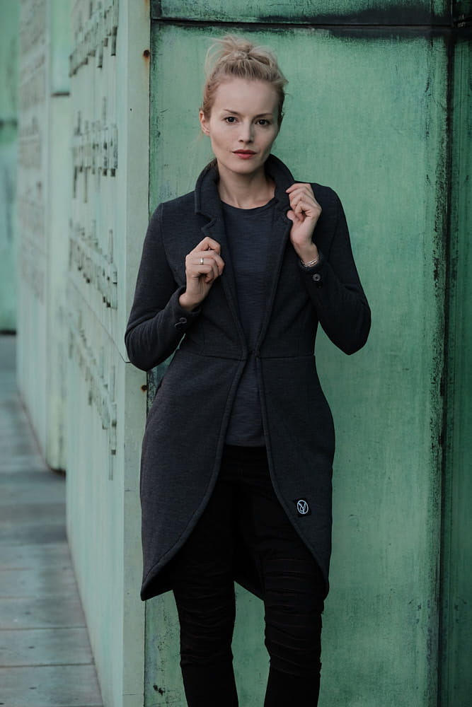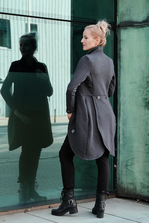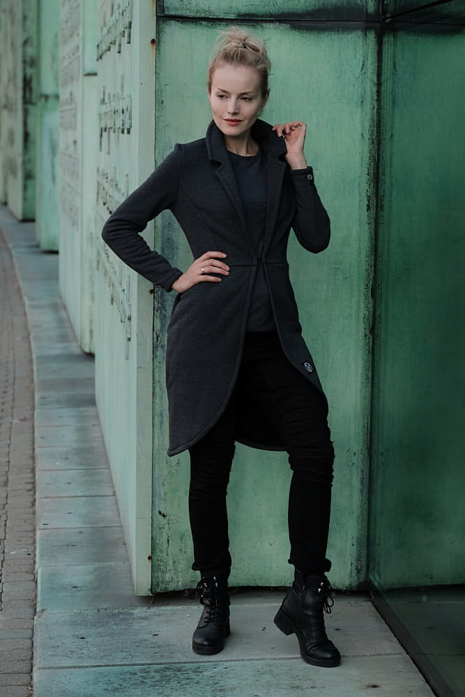 Uszyty jest z miękkiej dzianiny, która łatwo się pierze i nosi. Jest w eleganckim, grafitowym kolorze. Guziki na plecach i mankietach są w kolorach jasno i ciemno szarych. Revolter zapinany jest na haftkę wszytą po wewnętrznej stronie.