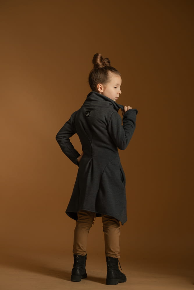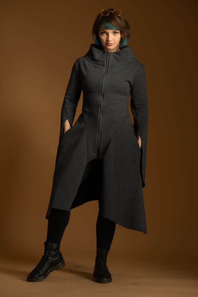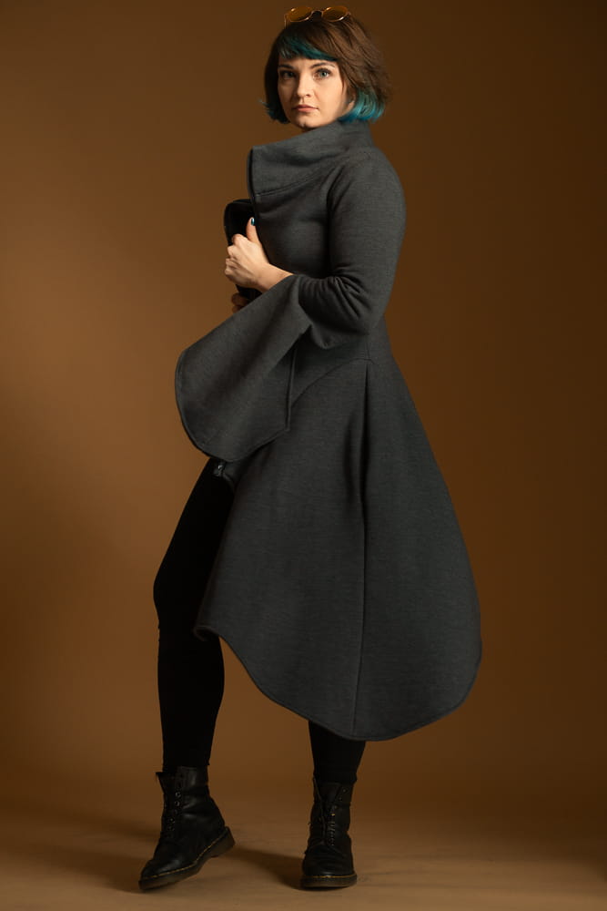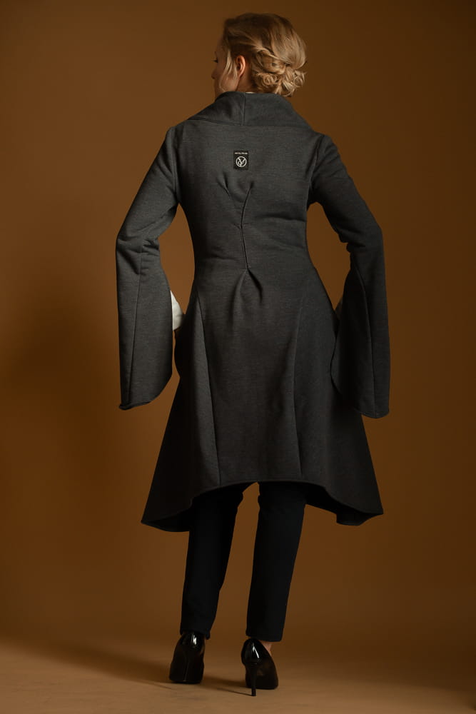 Płaszcz uszyty jest z miękkiej, grubej dzianiny, która łatwo się pierze i nosi. Dopasowana talia, rozkloszowany dół i rozcięte rękawy. Płaszcz nie ma podszewki i przeznaczony jest na sezony przejściowe.