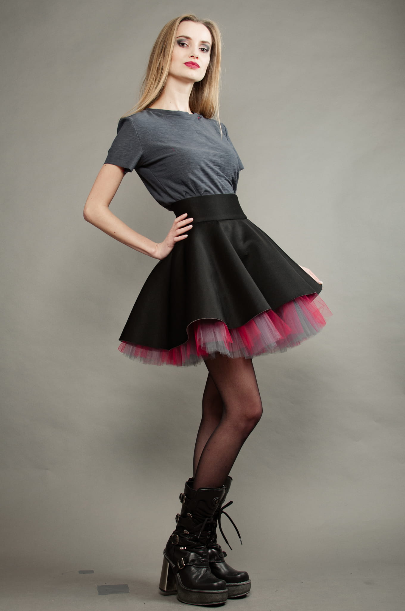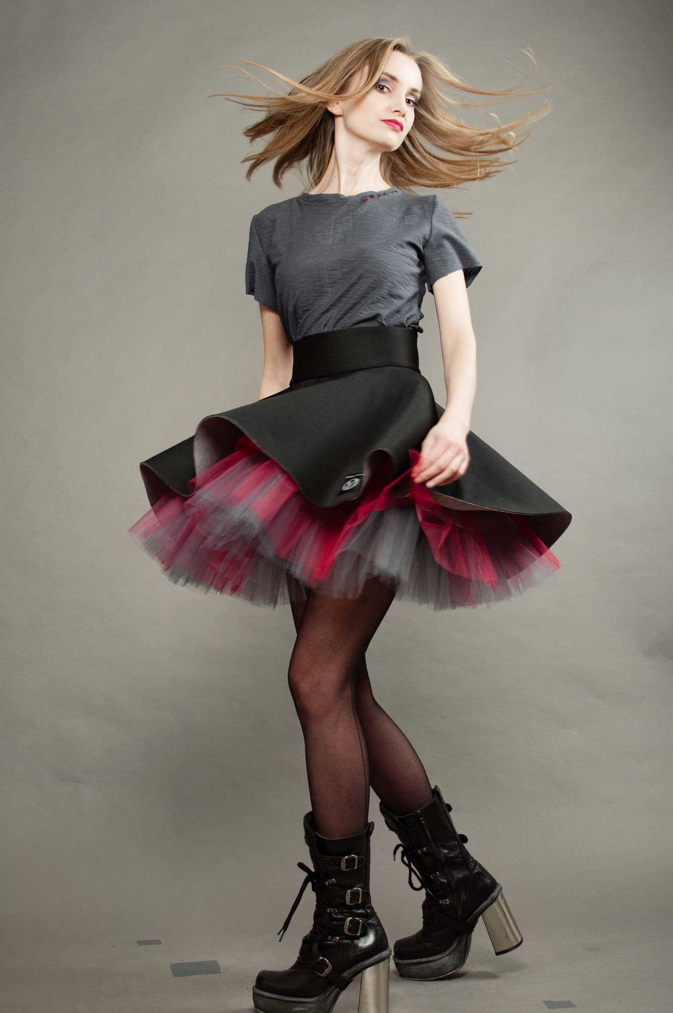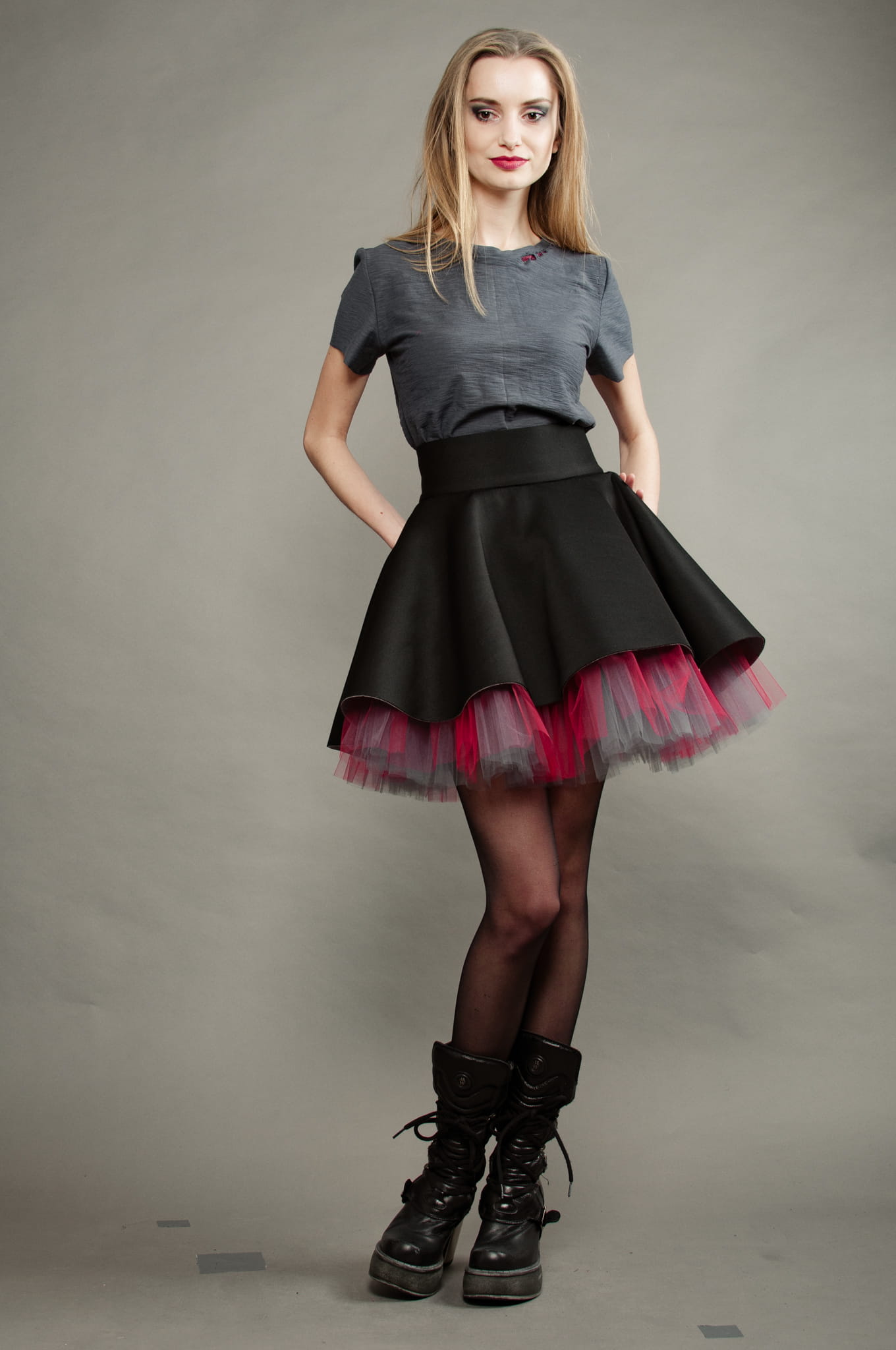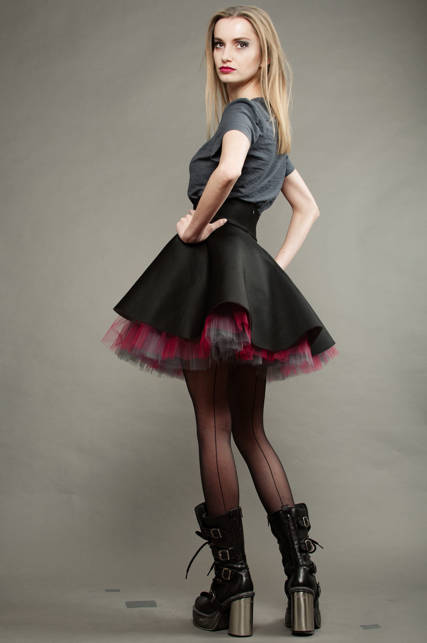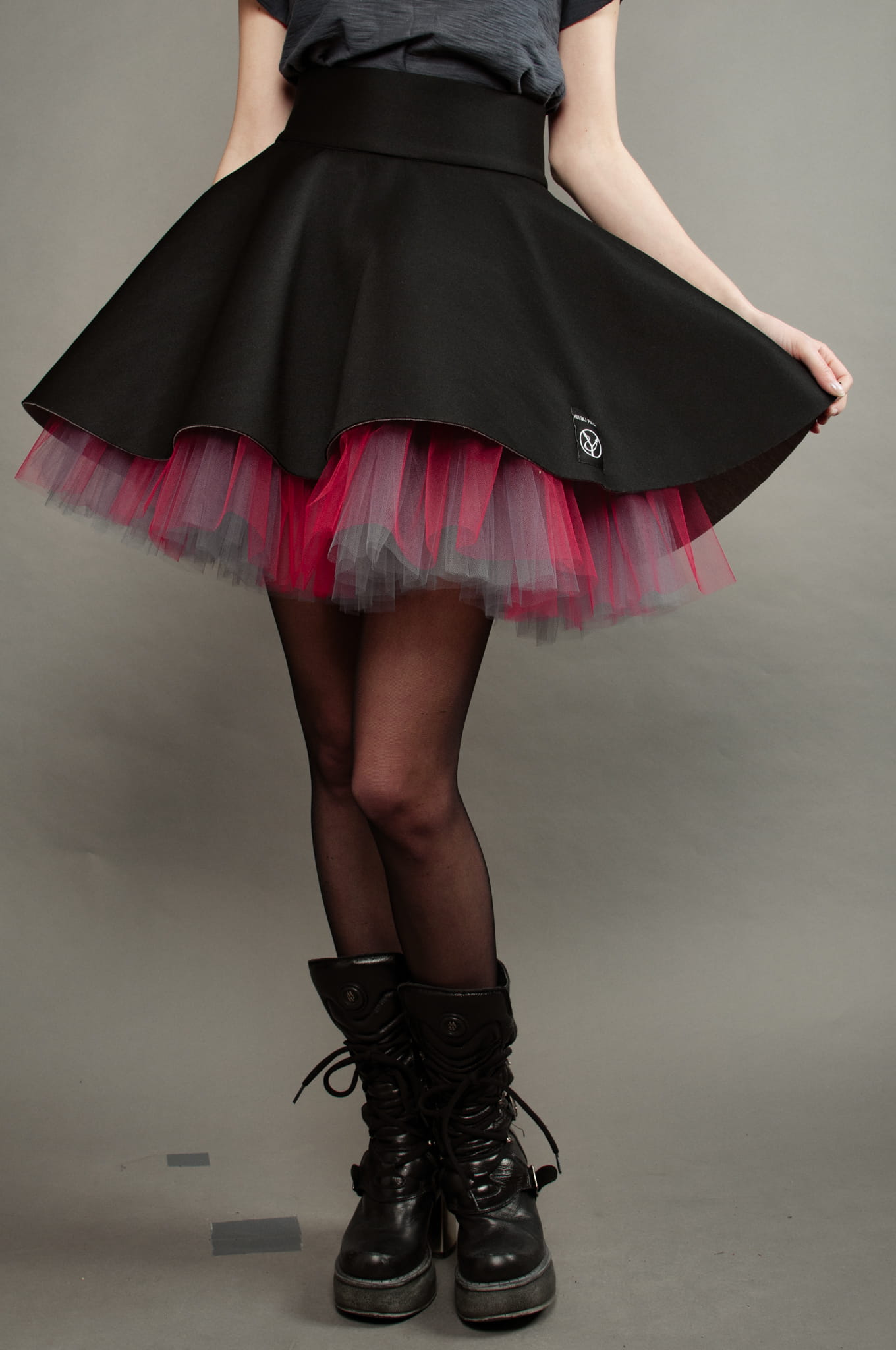 Czarny wierzch spódnicy podszyty został szarym i czerwonym tiulem.