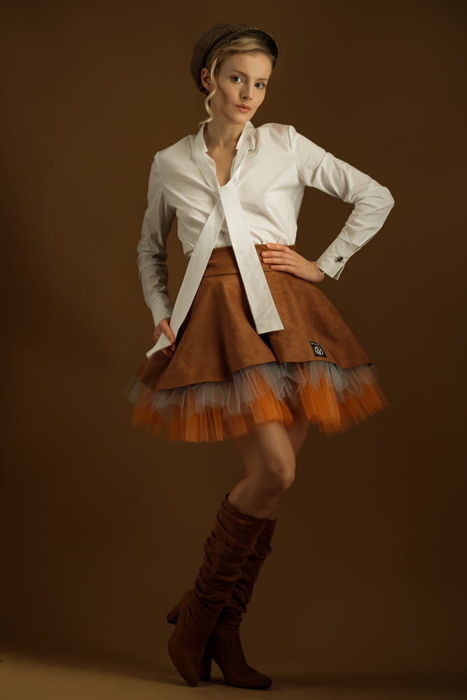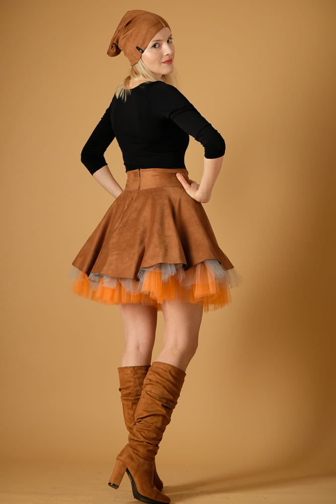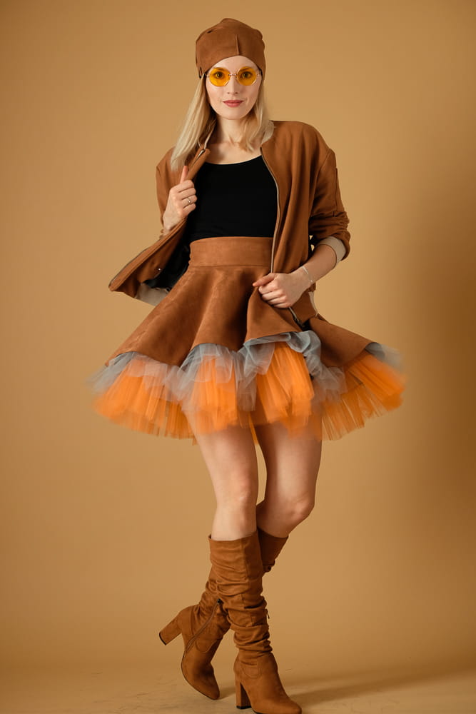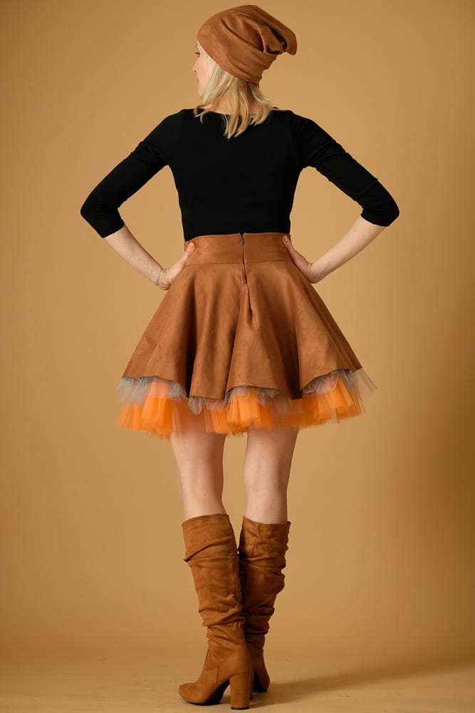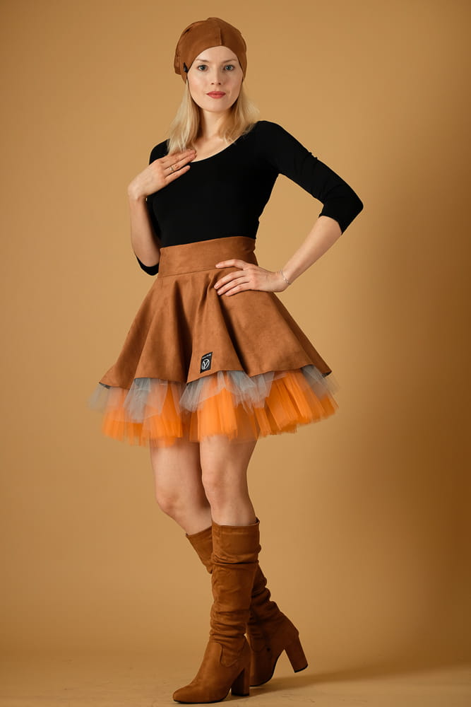 Taka spódnica wyróżni cię z tłumu zarówno w stylizacji streetowej, jak i wieczorowej. Uszyta zostałą z miękkiej, elastycznej dzianiny o strukturze zamszu w kolorze karmelowym oraz tiulowego spodu w kolorach jasnego pomarańczu i szarości.