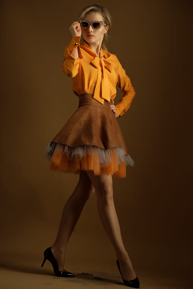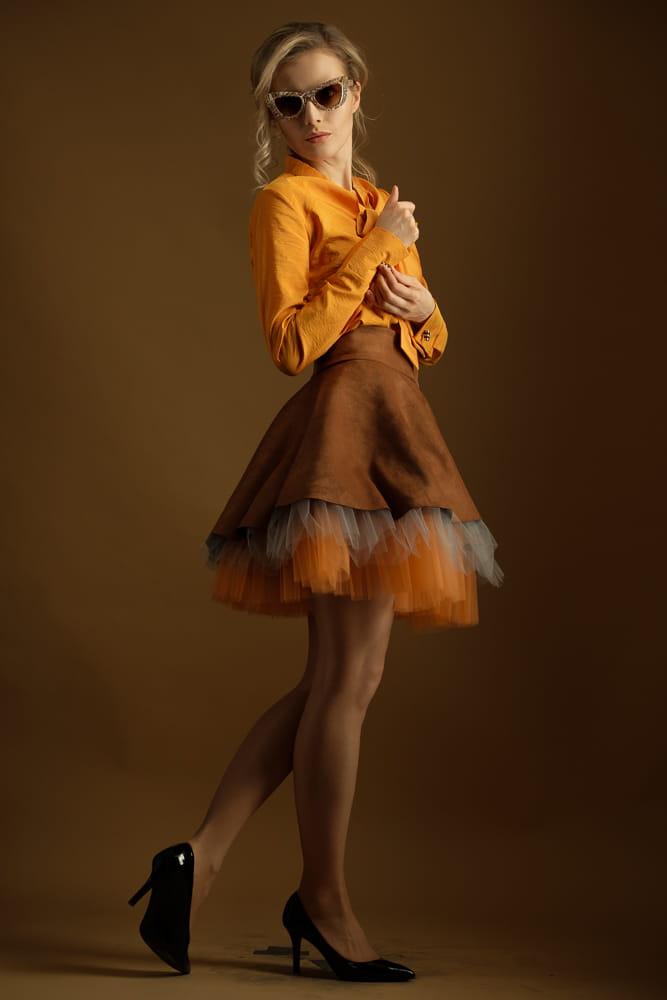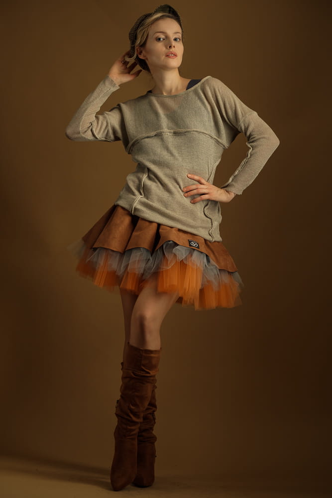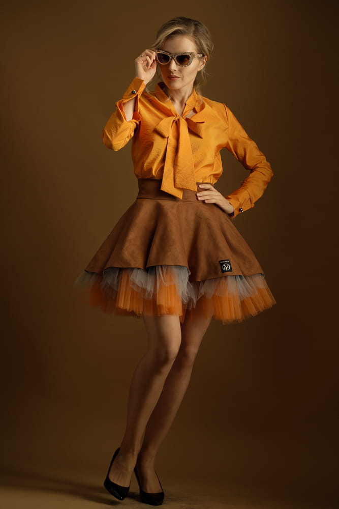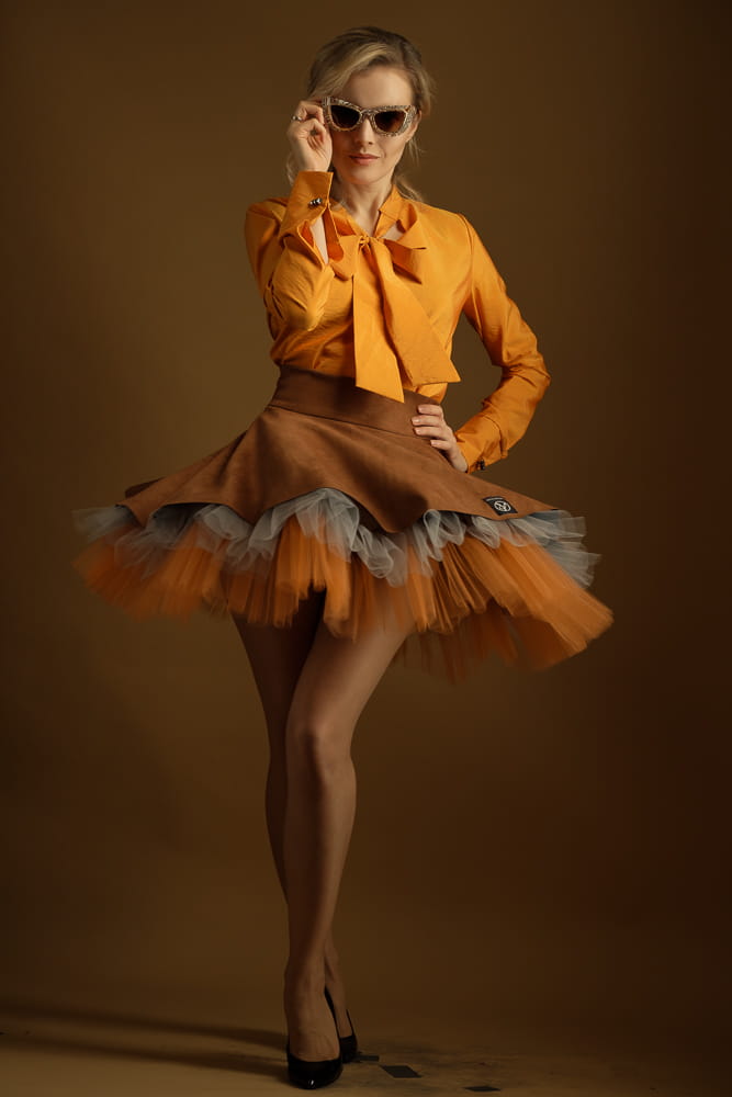 Taka spódnica wyróżni cię z tłumu zarówno w stylizacji streetowej, jak i wieczorowej. Uszyta zostałą z miękkiej, elastycznej dzianiny o strukturze zamszu w kolorze karmelowym oraz tiulowego spodu w kolorach jasnego pomarańczu i szarości.