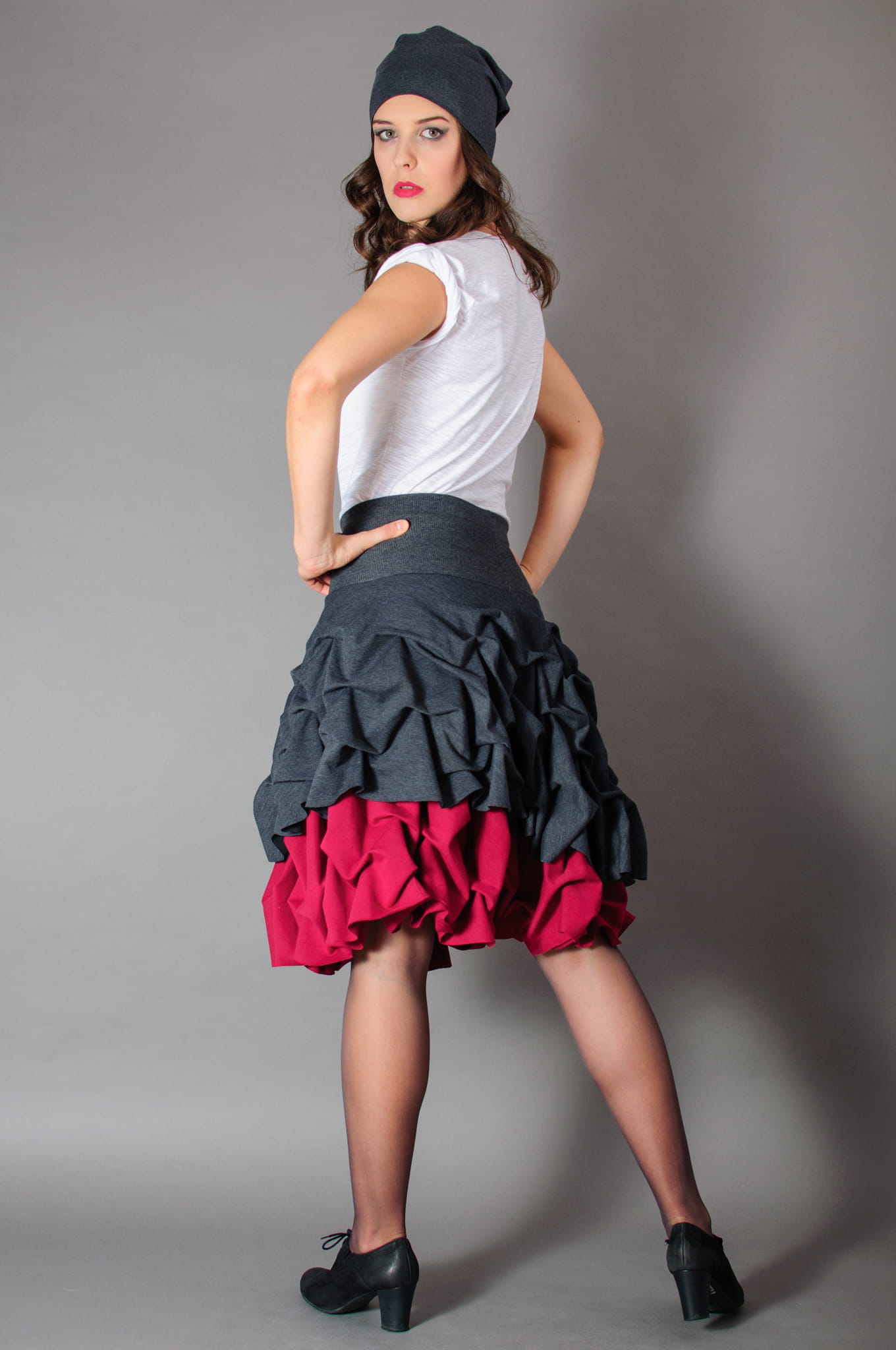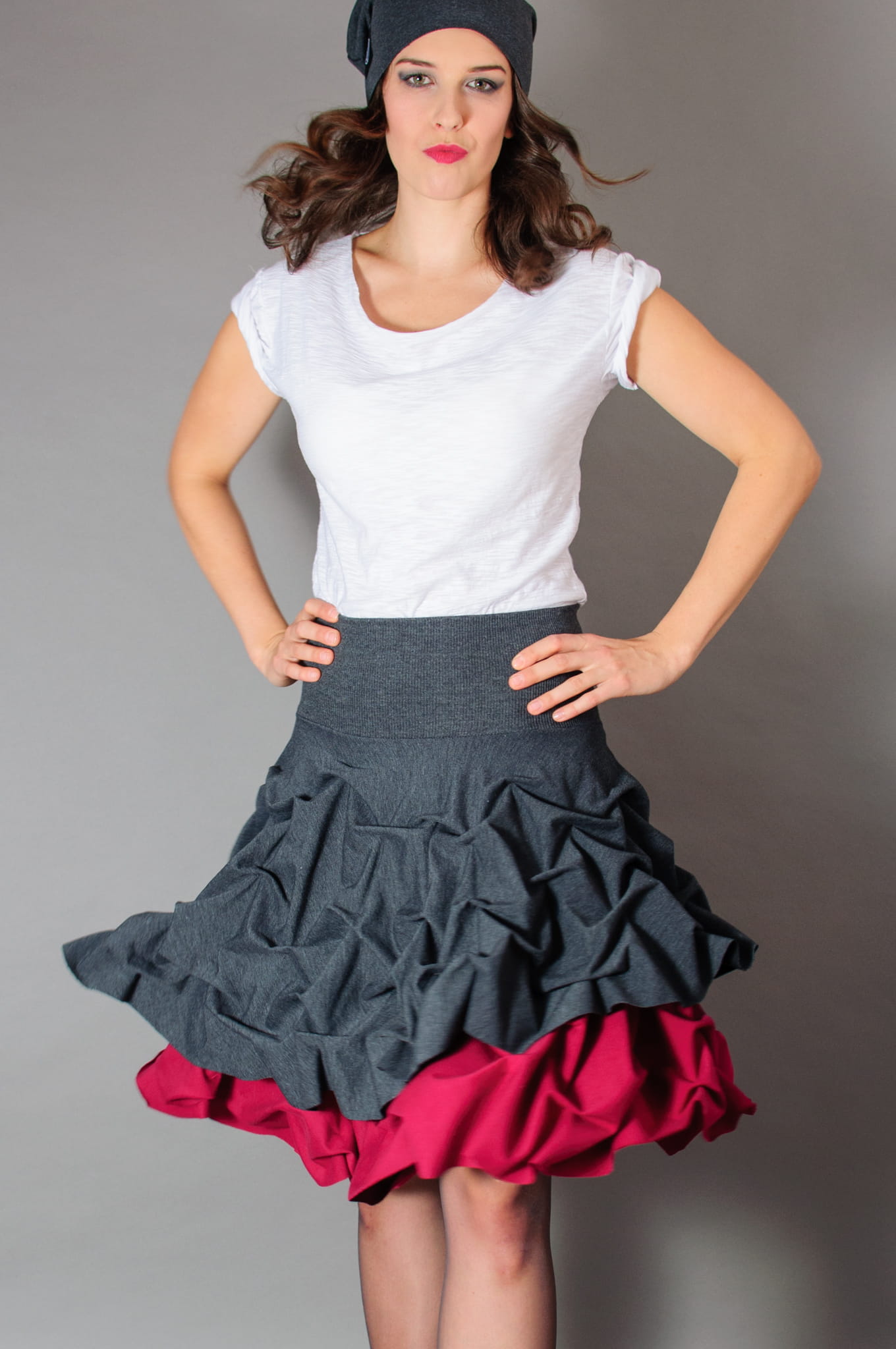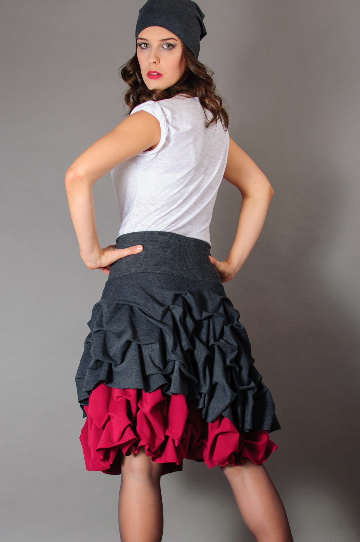 Krótka spódnica z falbanami od Hultaj Polski, uszyta z pełnego koła w grafitowym i bordowym kolorze. Dwa nałożone koła tworzą efekt wirowania, a miękka dzianina bawełniana (92% bawełna, 8% elastan) zapewnia komfort. Elastyczny pas dopasowuje się do talii. Ręcznie szyta w Polsce, idealna na każdą okazję – od szpilek po trampki.