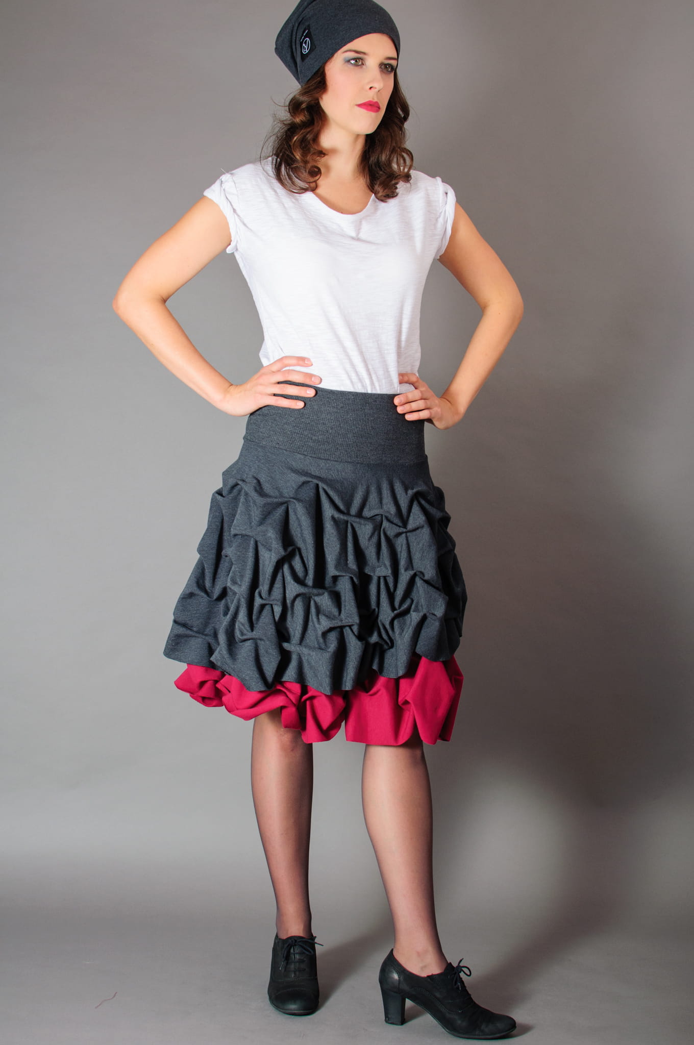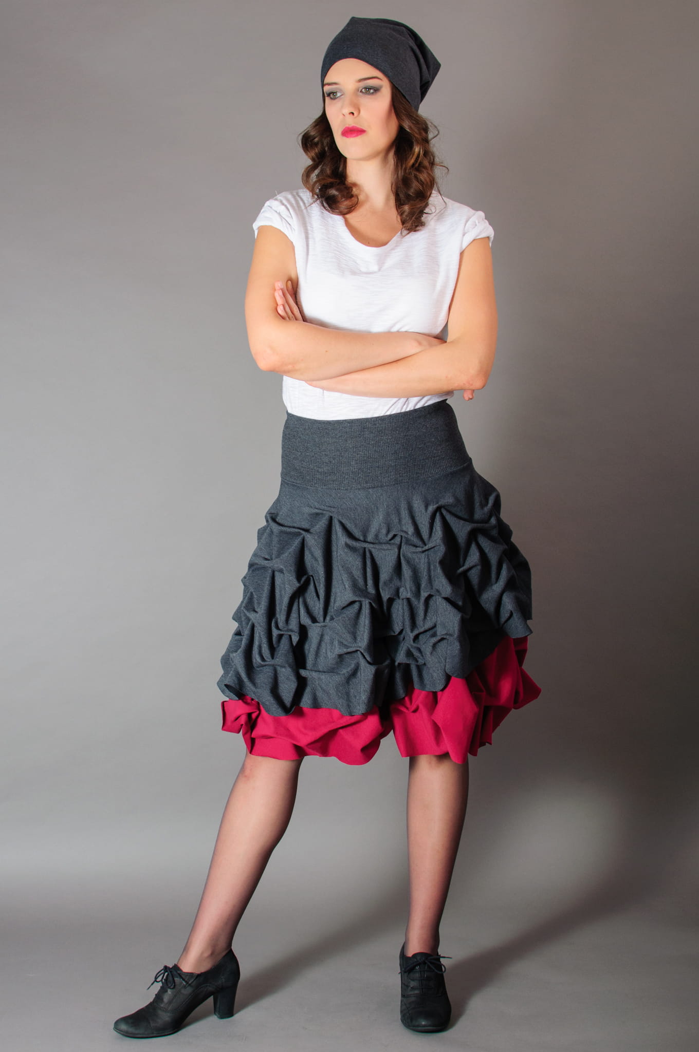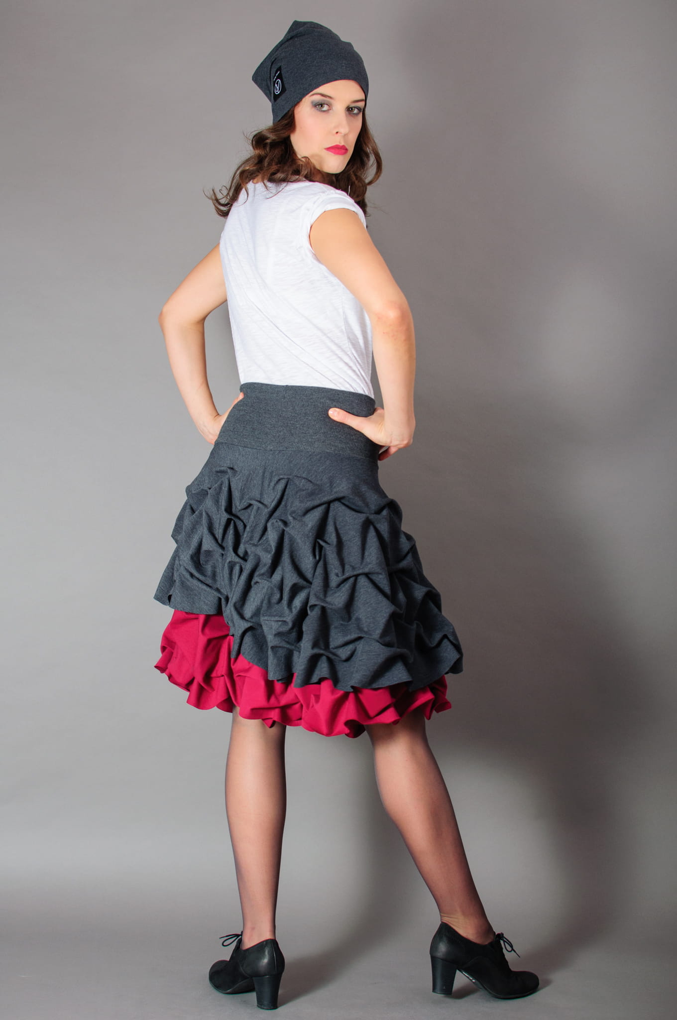 Krótka spódnica z falbanami od Hultaj Polski, uszyta z pełnego koła w grafitowym i bordowym kolorze. Dwa nałożone koła tworzą efekt wirowania, a miękka dzianina bawełniana (92% bawełna, 8% elastan) zapewnia komfort. Elastyczny pas dopasowuje się do talii. Ręcznie szyta w Polsce, idealna na każdą okazję – od szpilek po trampki.
