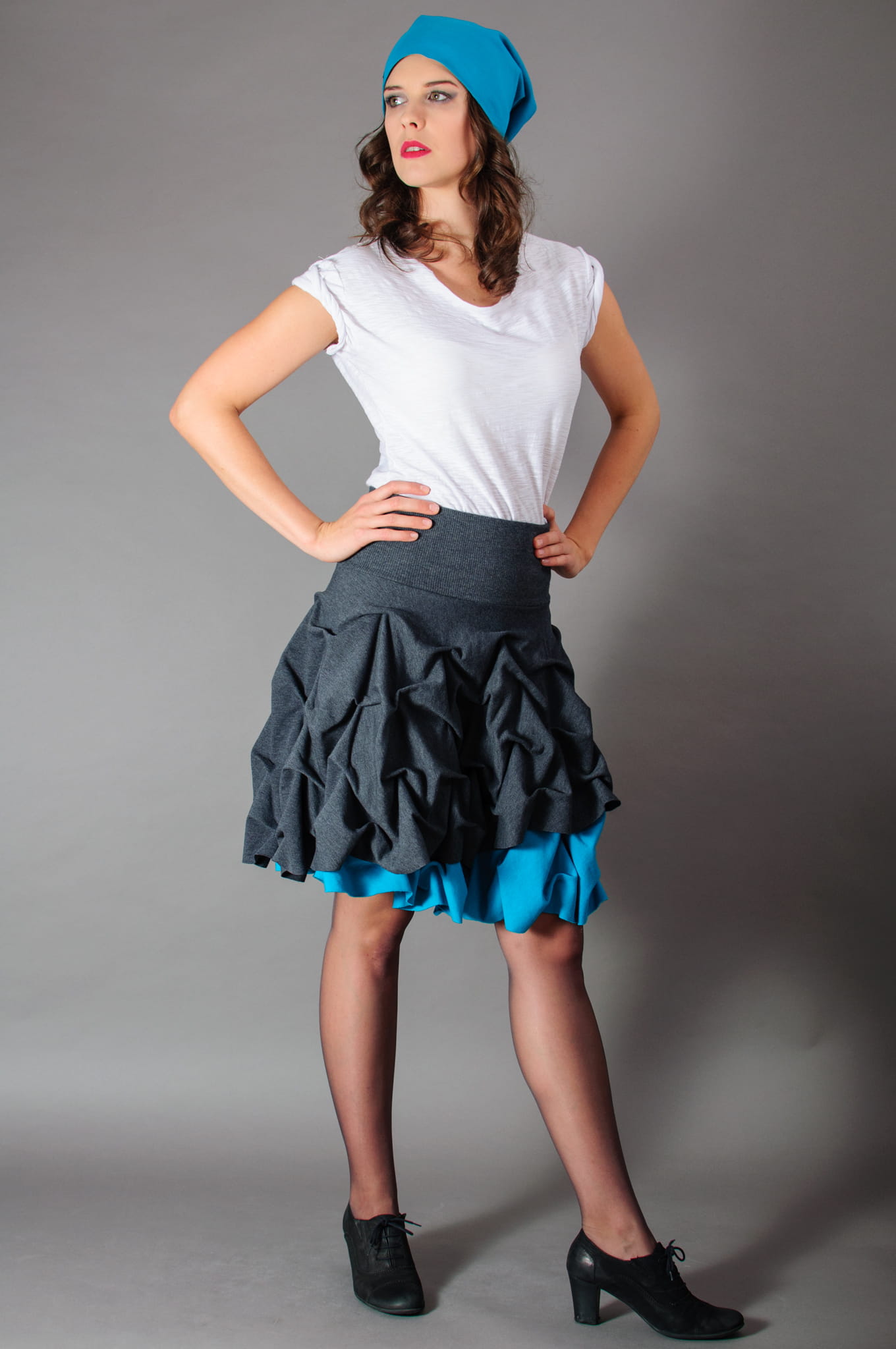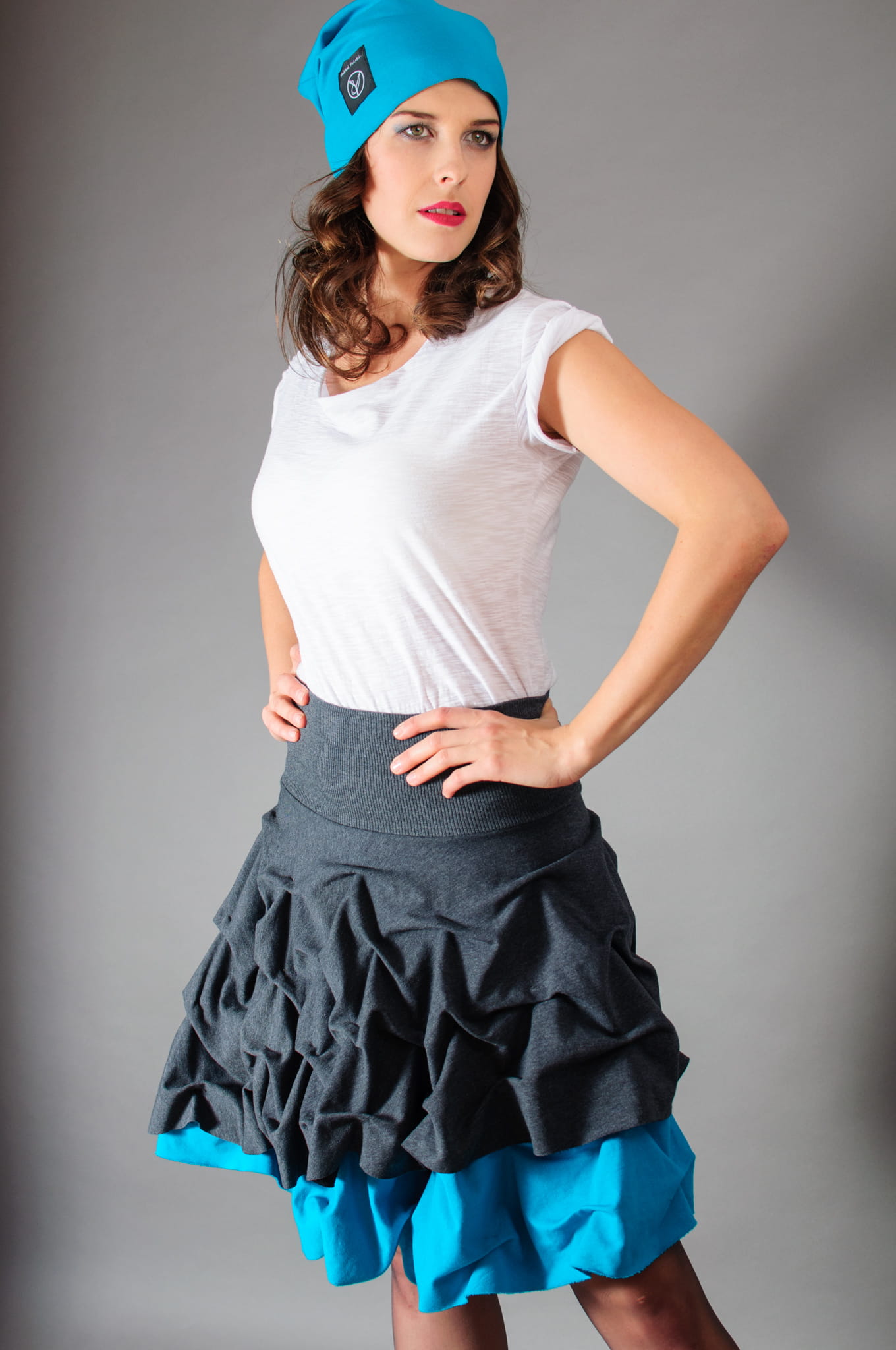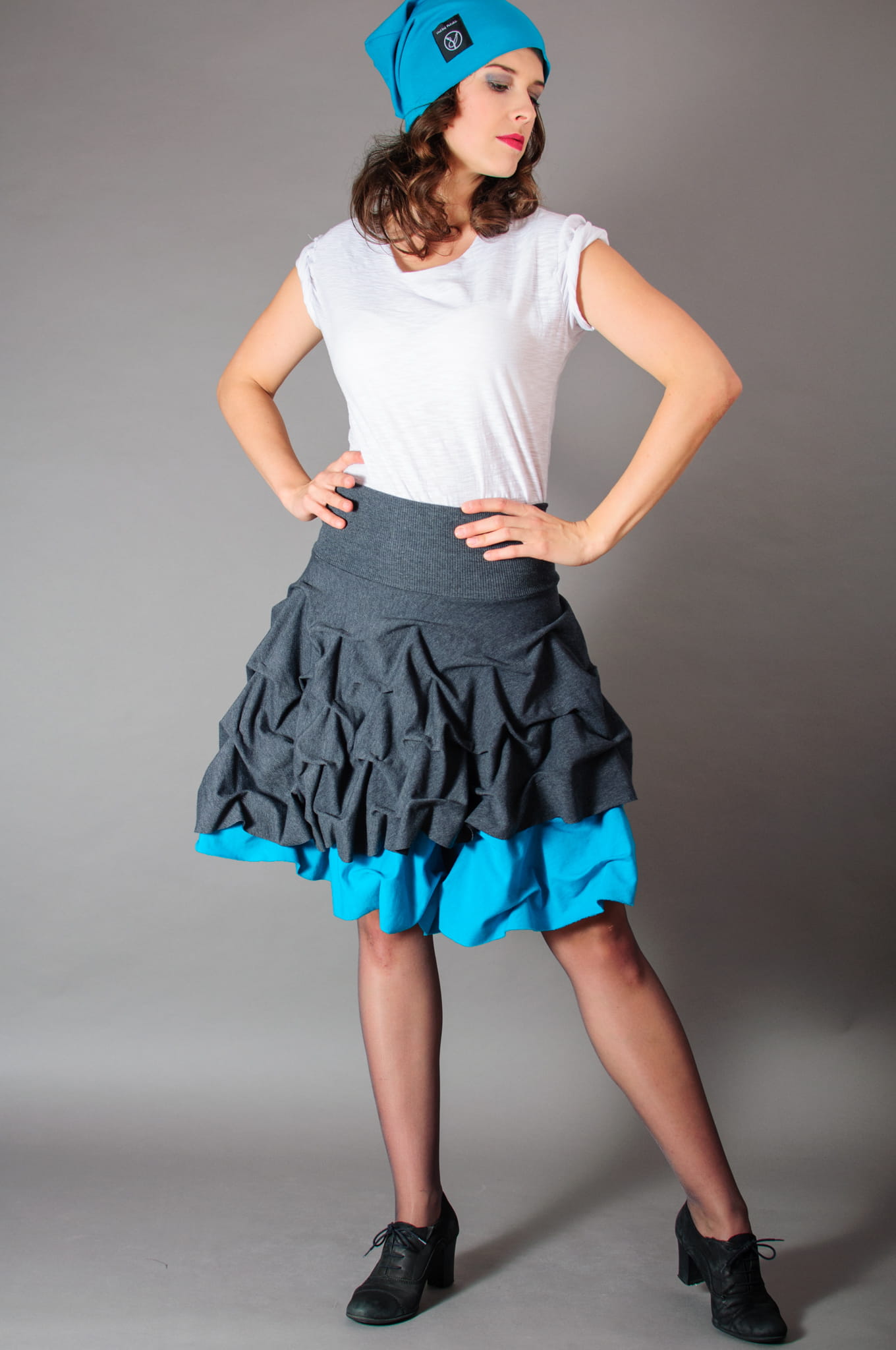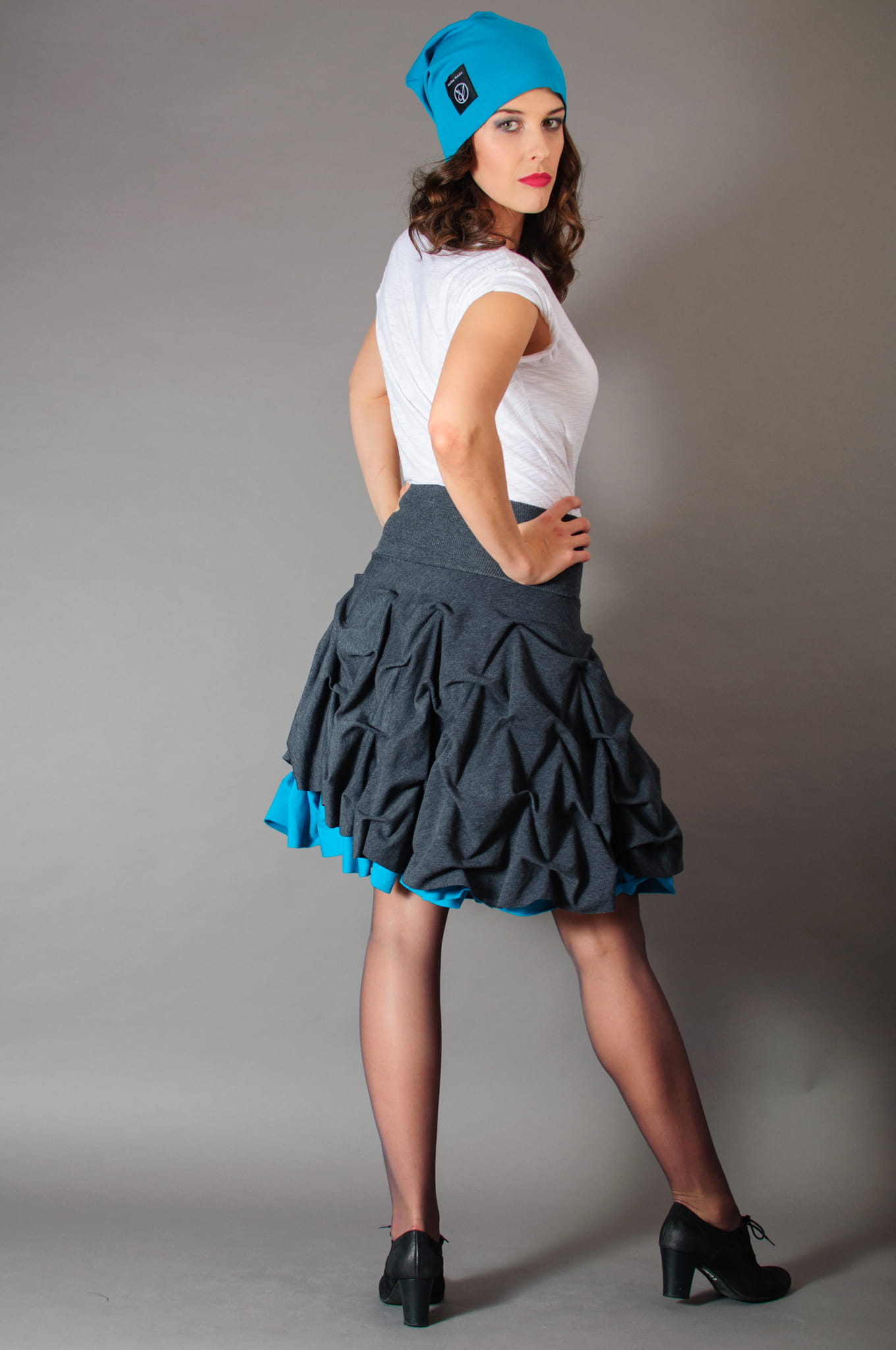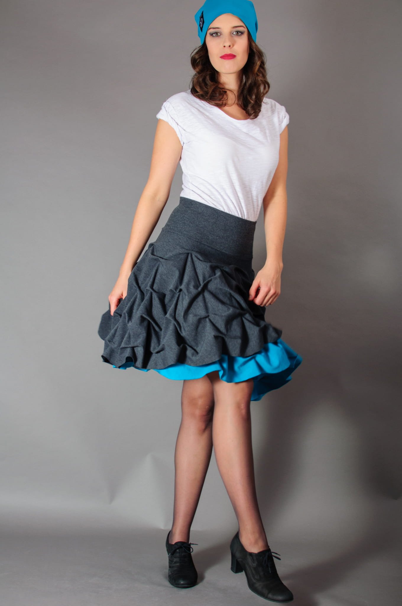 Połączenie szarości i pięknego turkusowego koloru. Doskonała zarówno na wyjątkowe okazje, jak i do codziennego użytku. Pasuje do szpilek, do glanów i do pantofli. Dwa pełne, nałożone na siebie koła powodują, że spódnica kręci się naprawdę spektakularnie.