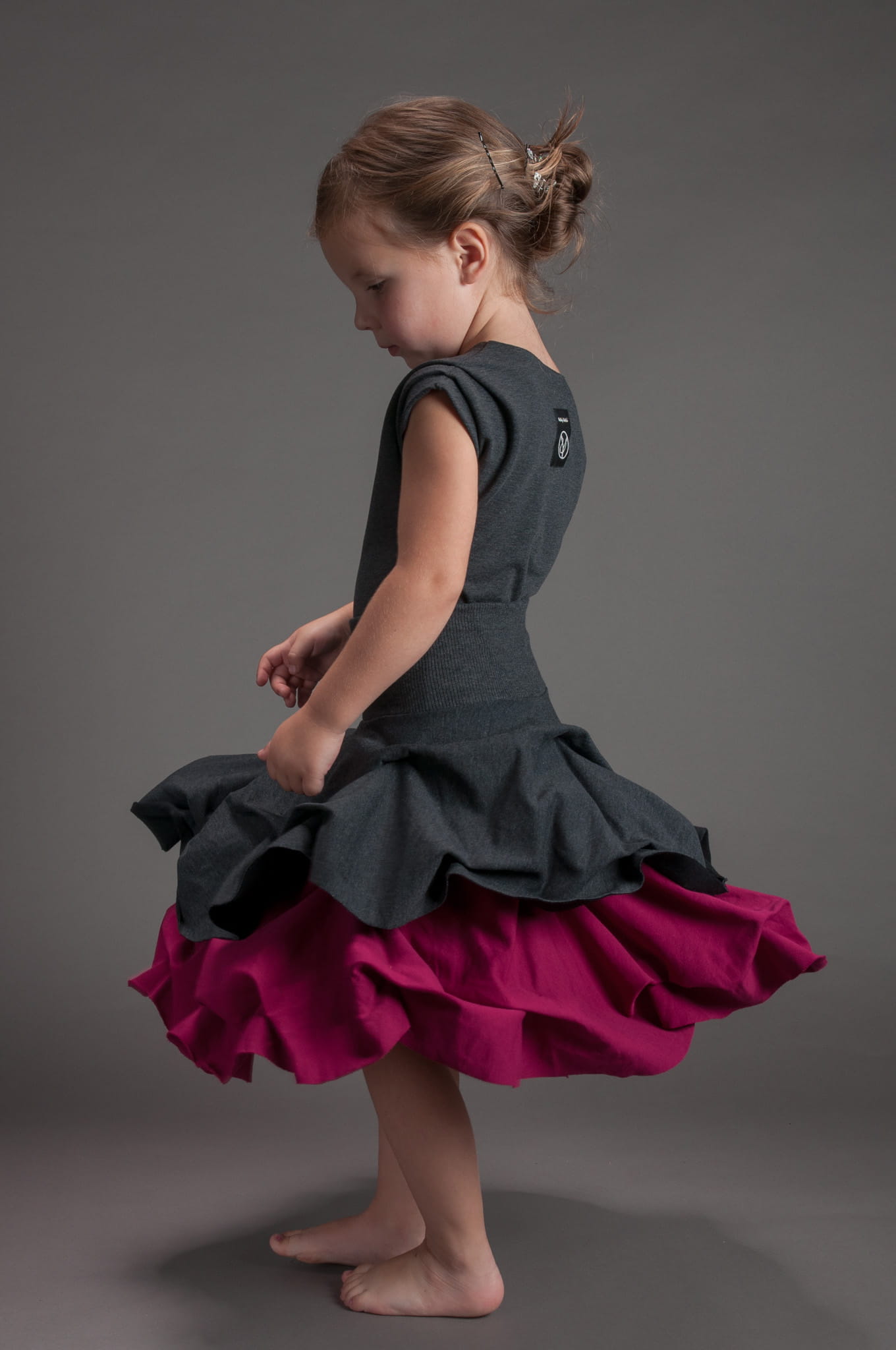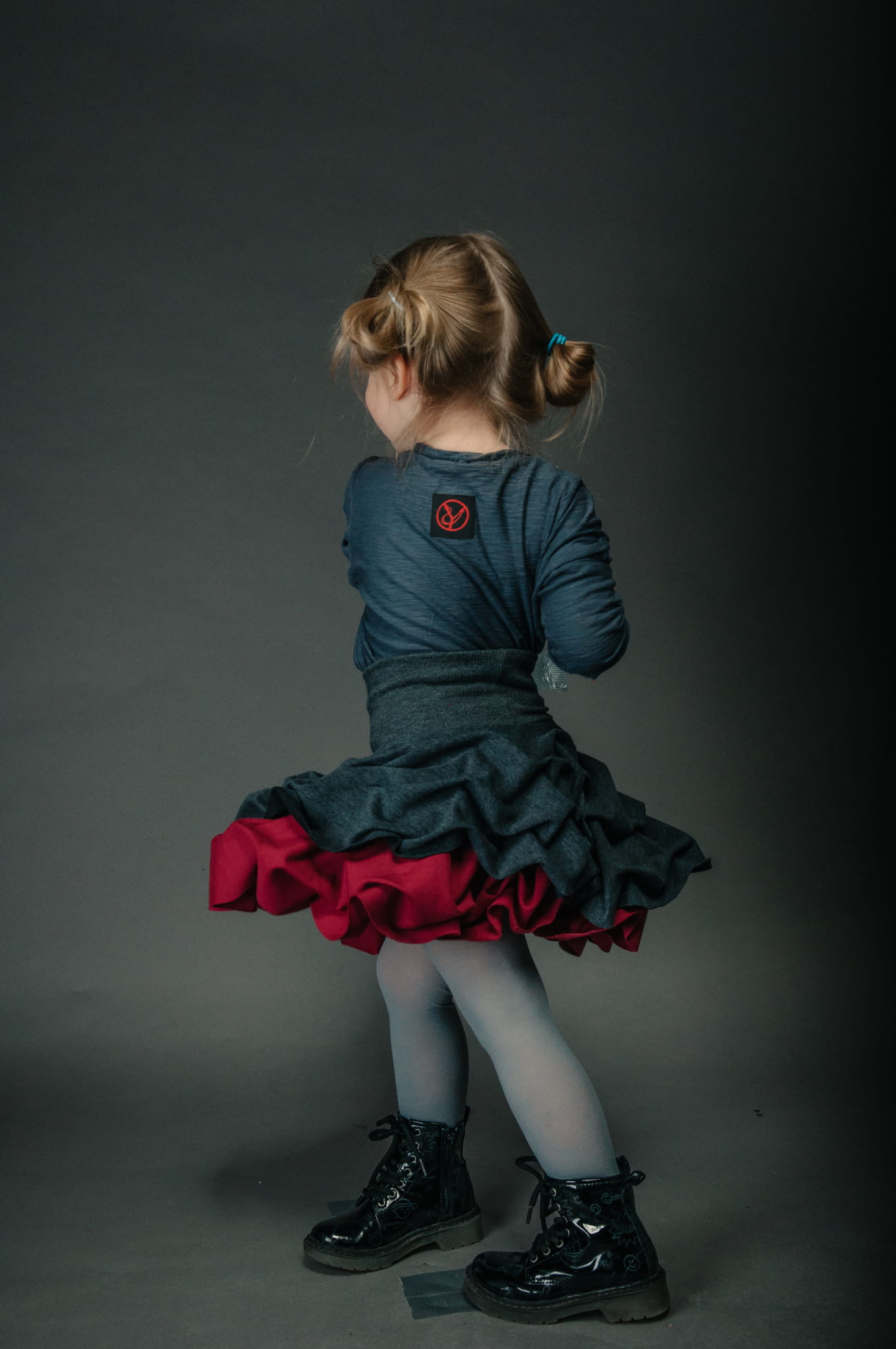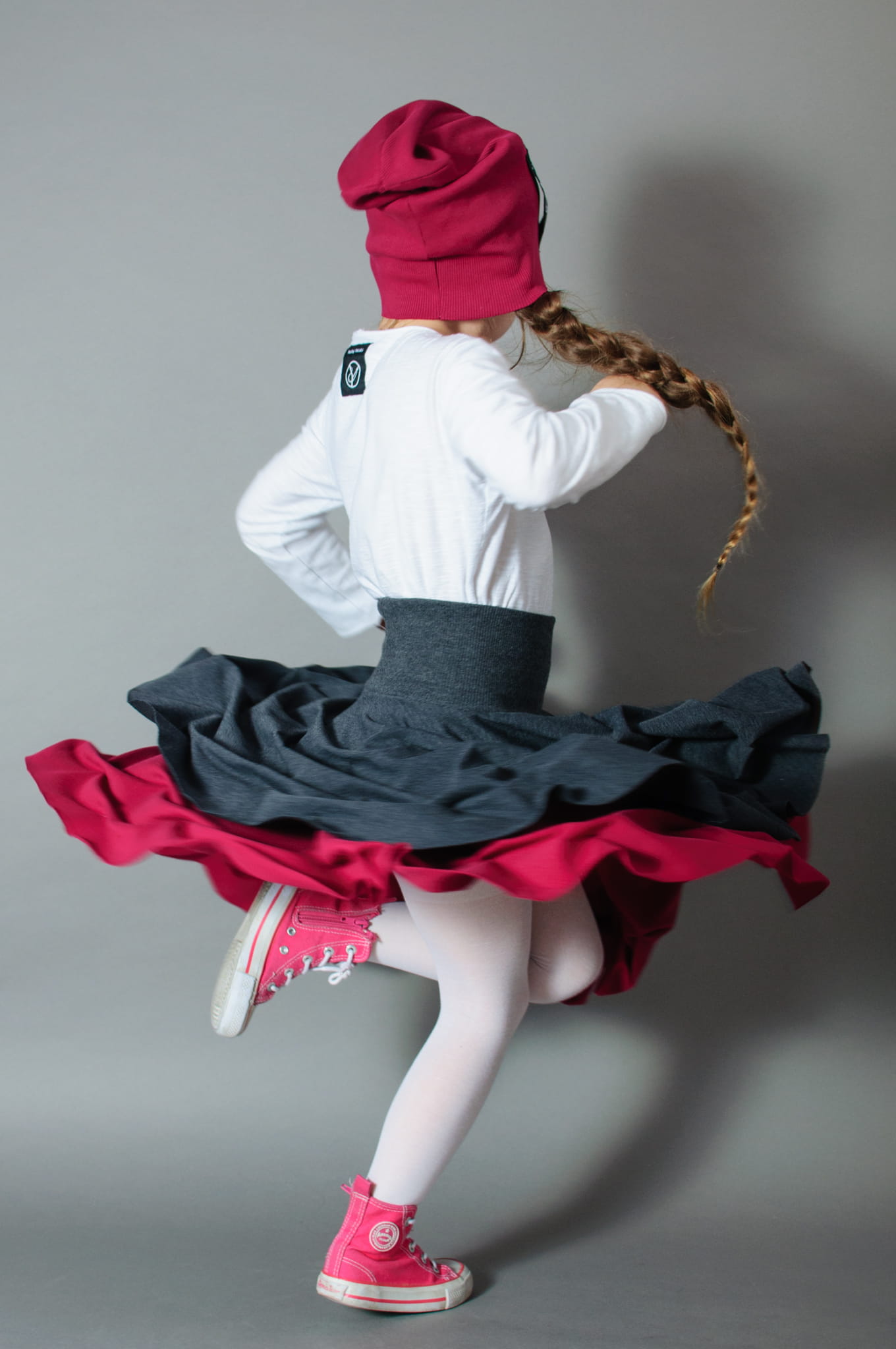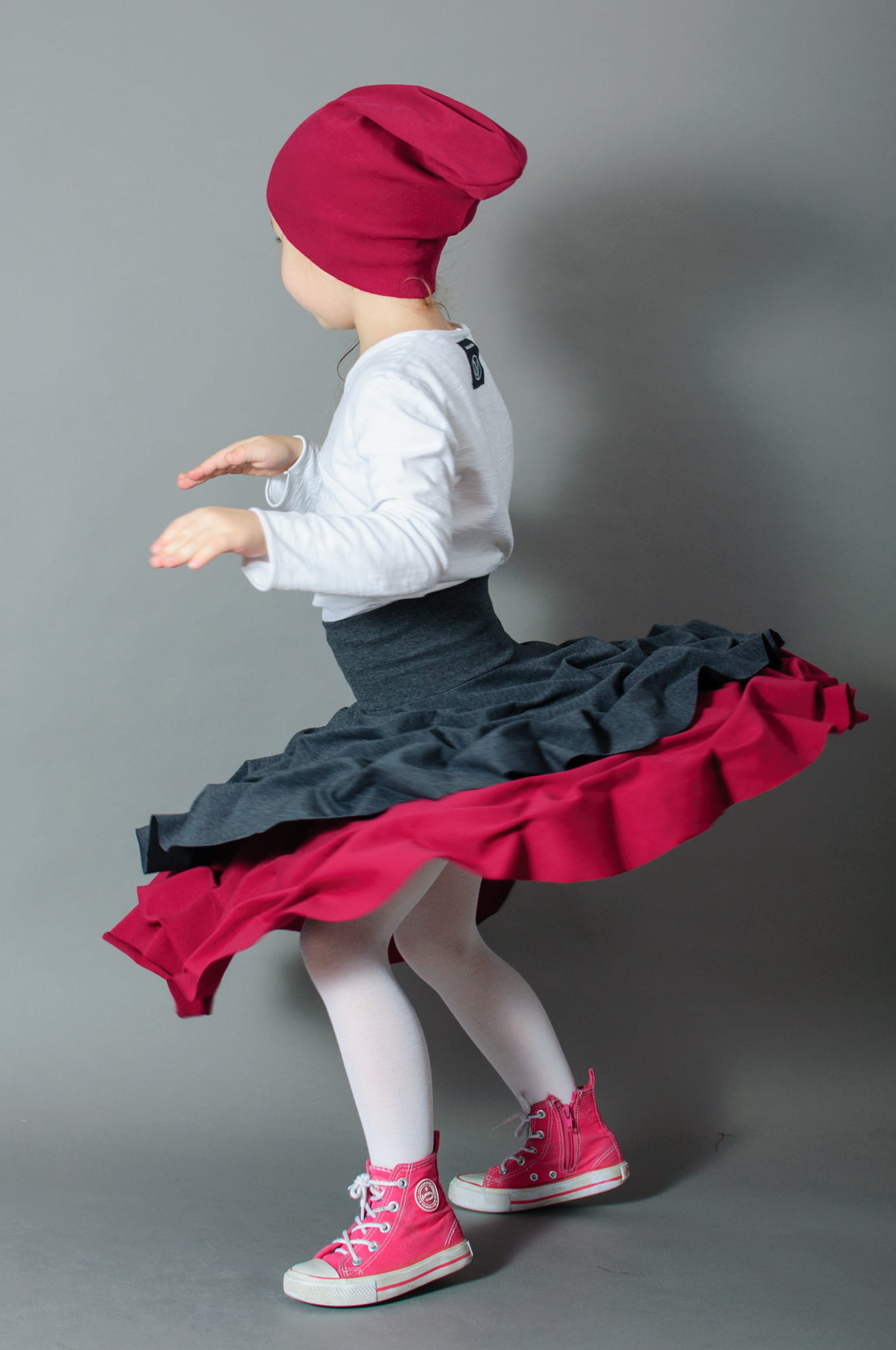 Każda młoda hultajka lubi spódnice „kręcone”. A ta jest właśnie taka. Do tego dołożyliśmy przepiękny bordowy kolor połączony z szarością. Taka spódnica,szczególnie w ruchu, nie może pozostać niezauważona.