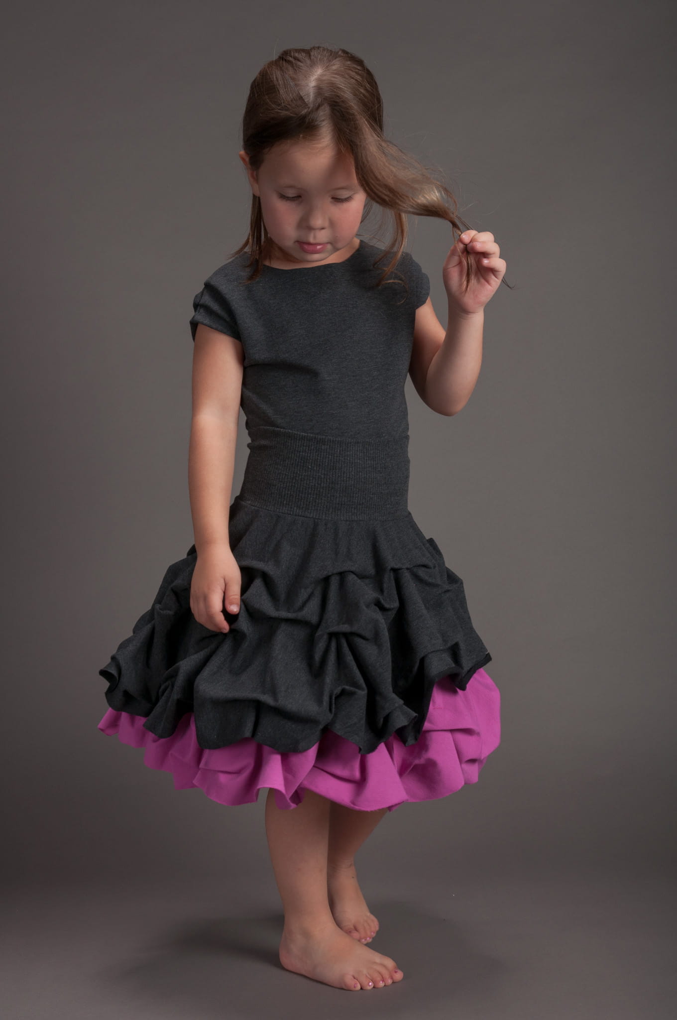 Bardzo elastyczny ściągacz w talii. Spódniczka występuje w trzech rozmiarach. Wersja dłuższa pasuje też na mniejsze dziewczynki – będzie rosła razem z dzieckiem i po jakimś czasie zmieni swoją funkcję ze spódniczki długiej na krótką.