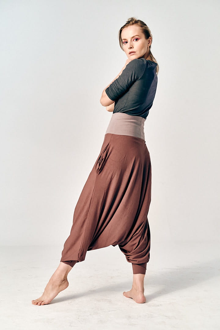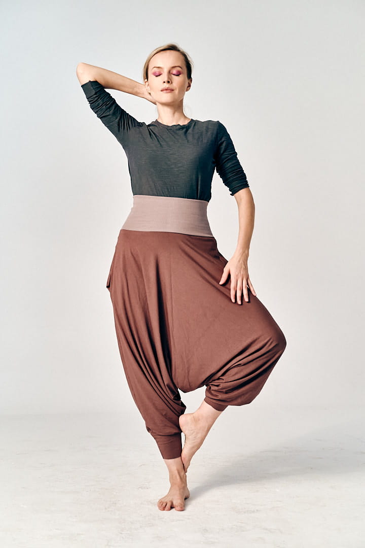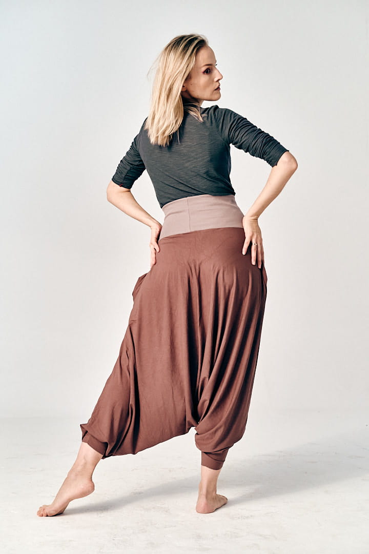 - Komfort na co dzień: Luźny krój i miękka bawełna sprawiają, że te kakaowe alladynki są doskonałe do jogi lub odpoczynku.