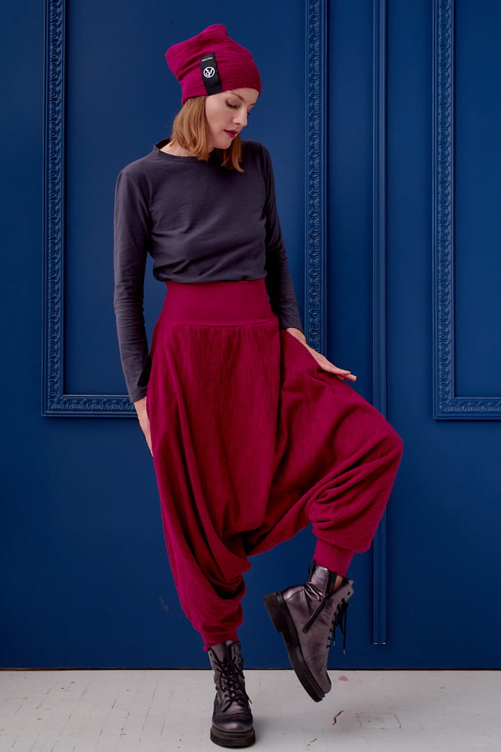 Te bordowe Haremki to idealne wygodne spodnie boho – połącz je z botkami i szalem, jak na zdjęciu, lub z trampkami dla sportowego looku. Pasują do jogi, spacerów i wieczornych wyjść – to prawdziwe Haremki do jogi i nie tylko!