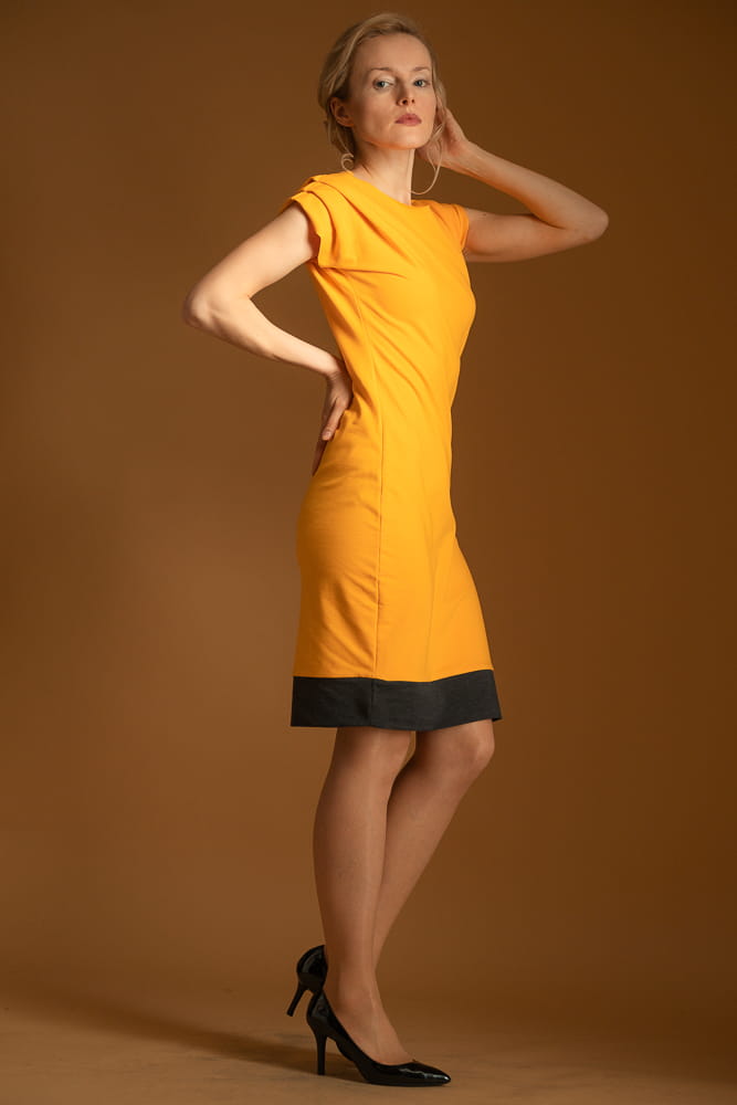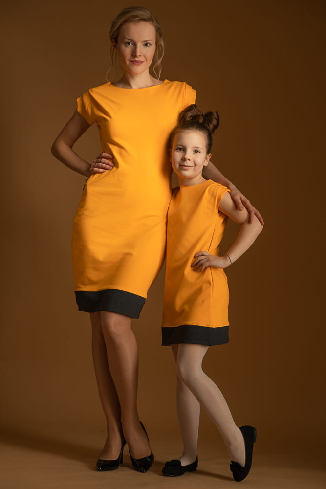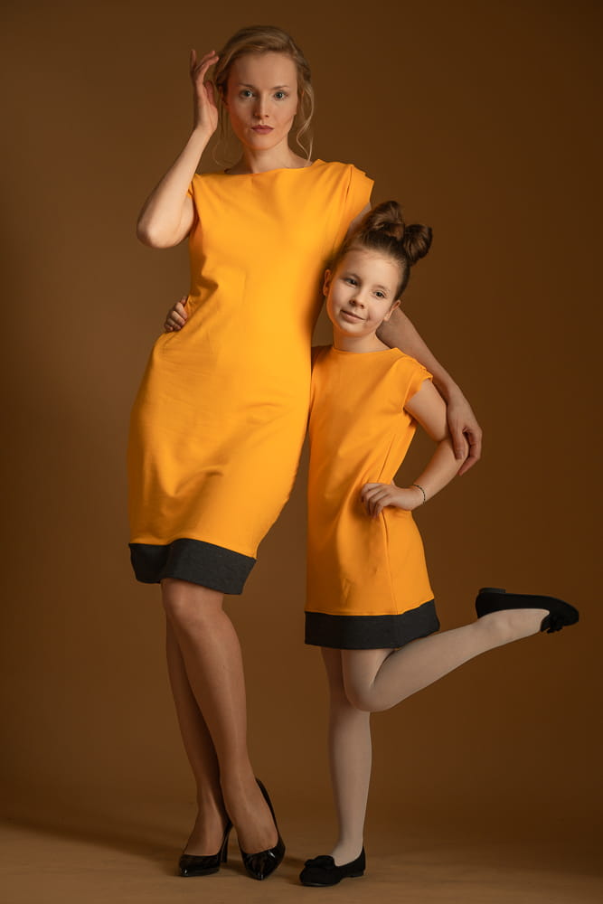Eleganckie połączenie dla Mama/Córka w energetycznym kolorze mandarynki stonowanym odrobiną grafitowej szarości. Obie sukienki są lekkie i przewiewne. Ozdobiono je zawadiackimi fałdkami na ramionach, które dodają sukienkom hultajskiego charakteru.
