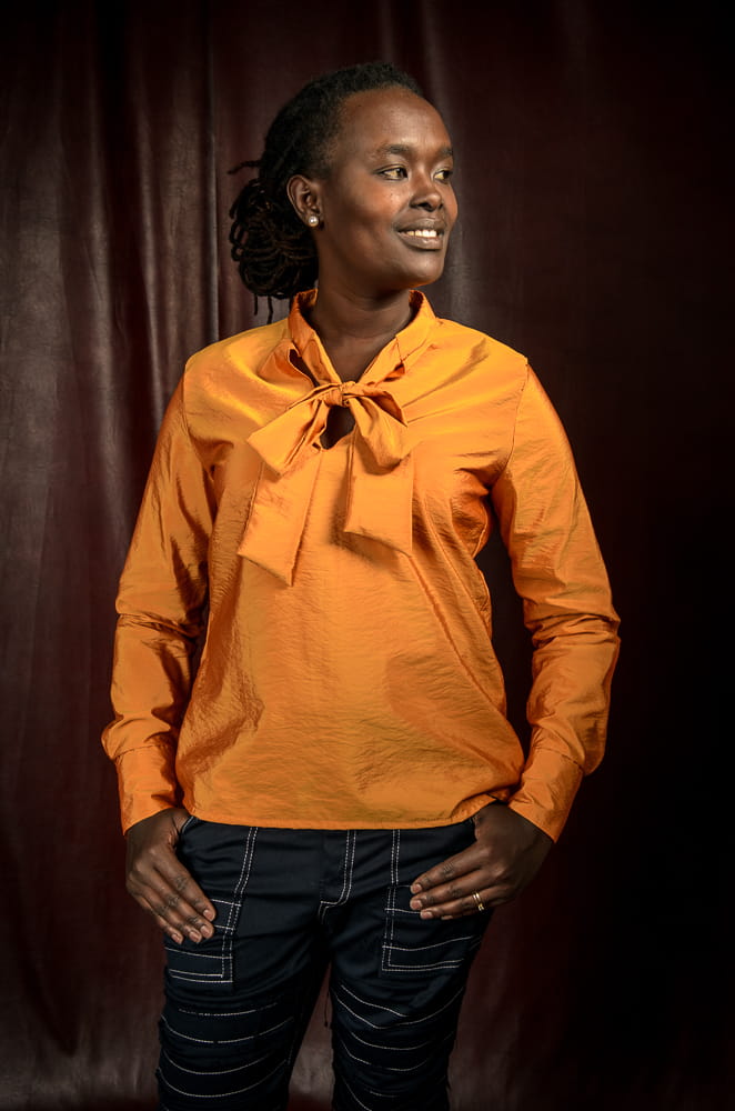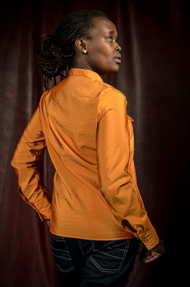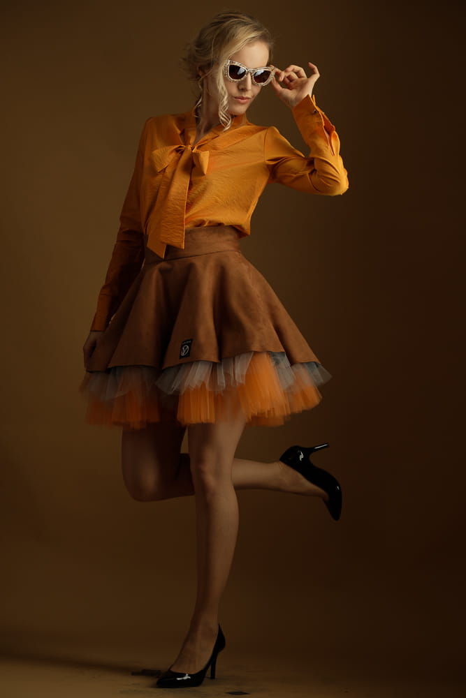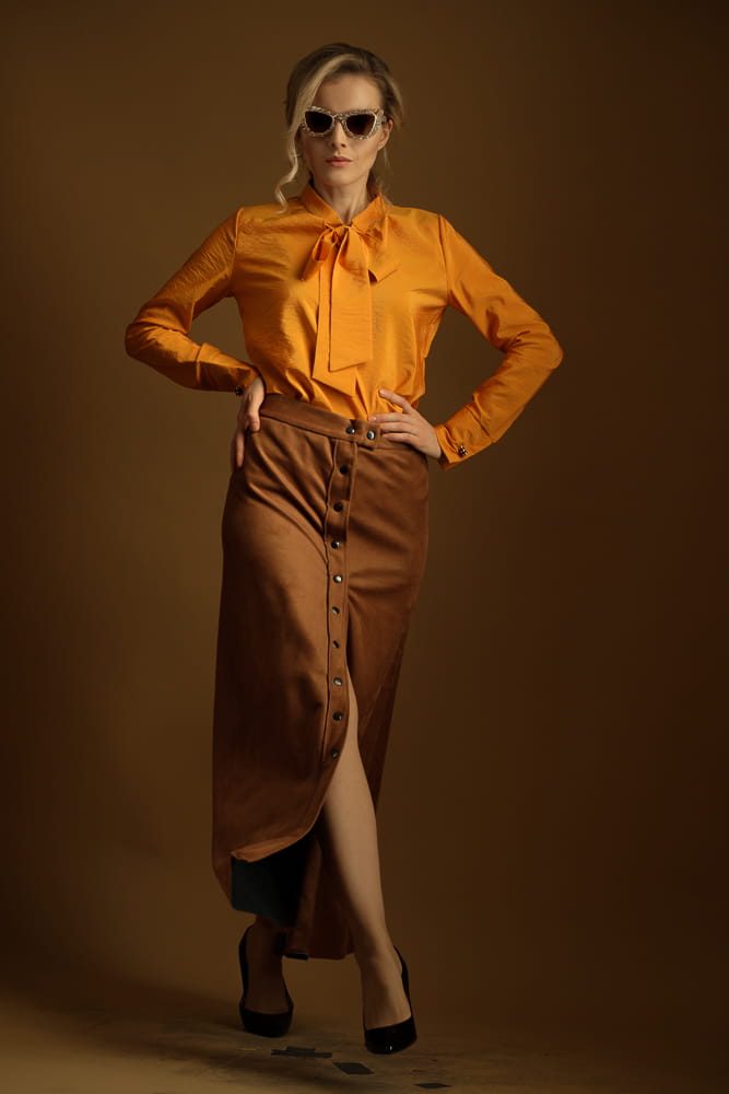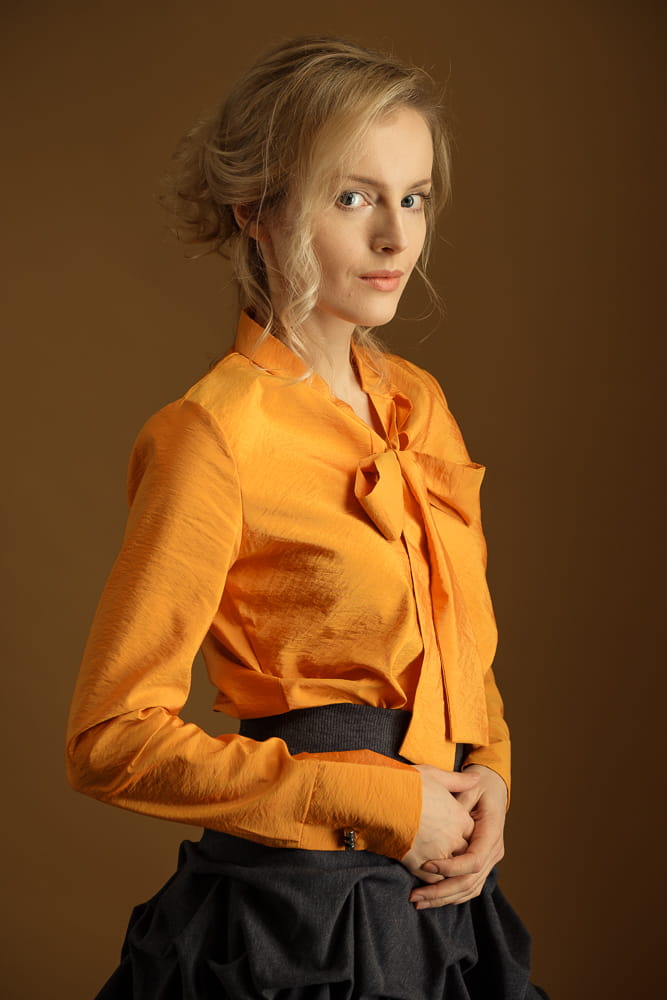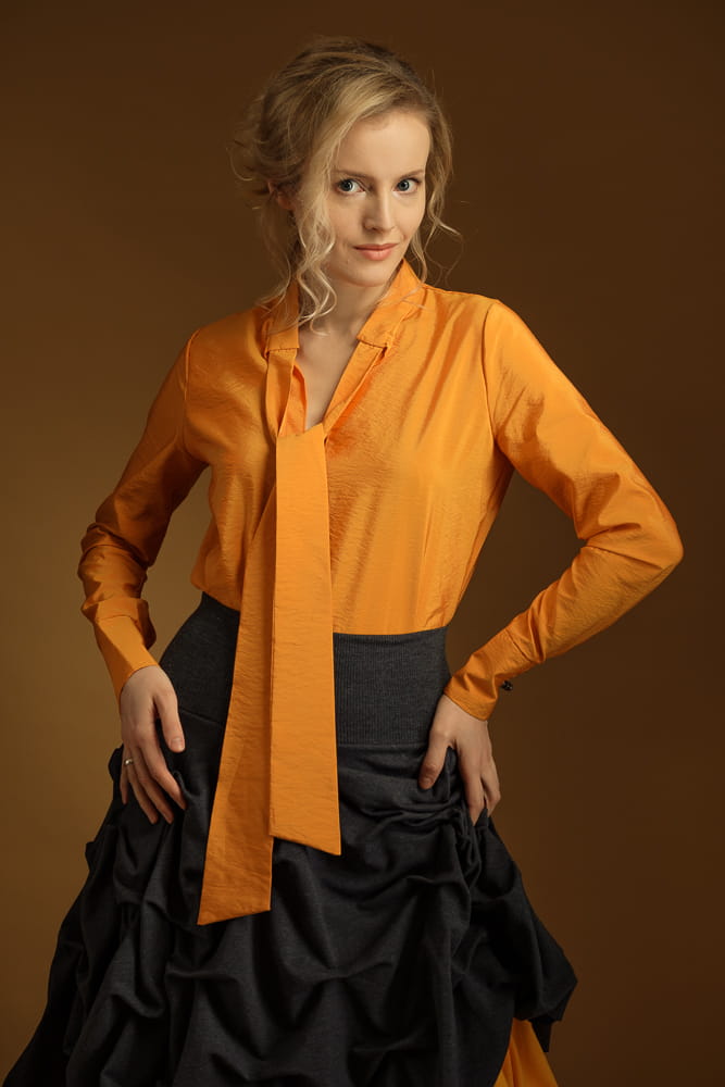Nietuzinkowa koszula w kolorze złotych jesiennych liści. Dekolt to stójka z szarfą, którą można zawiązać w krawat lub kokardę. Koszula jest wkładana przez głowę, taliowana. Nie jest pasowana, co powoduje, że z pewnością będziesz czuć się w niej swobodnie.
